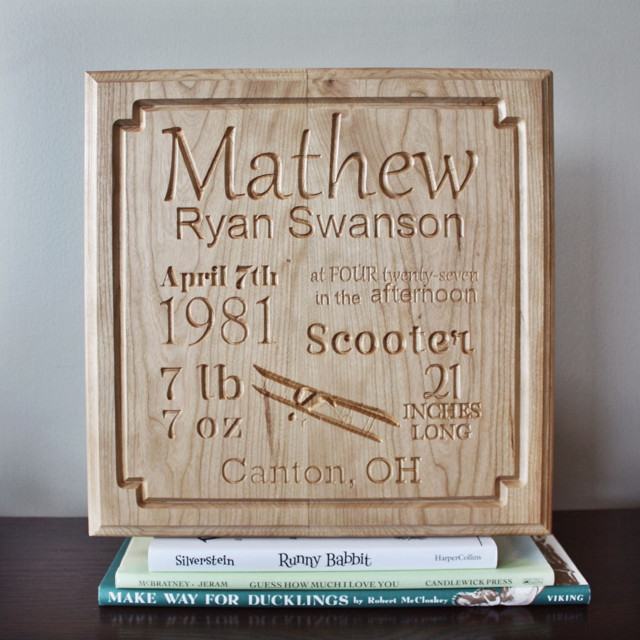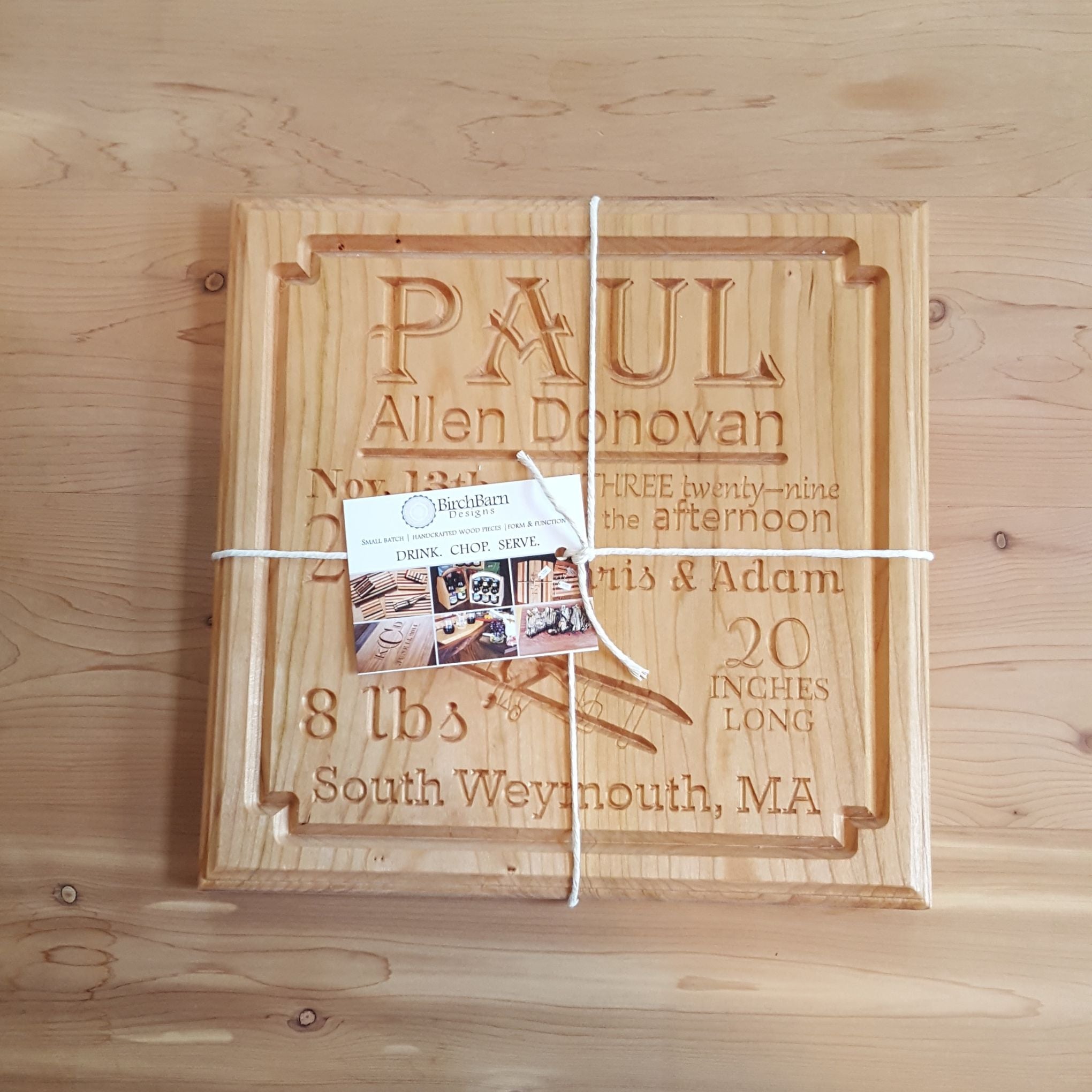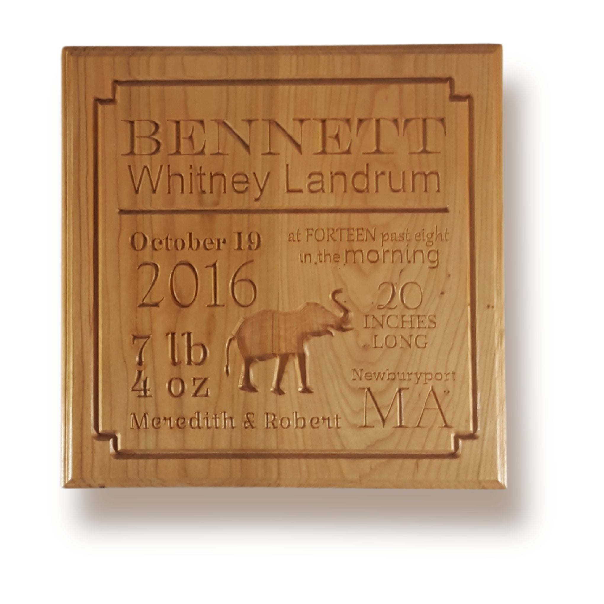 A thoughtful addition to any nursery, our personalized engraved baby birth board is handmade from beautiful cherry wood. It comes ready to hang with a mounting hole on the back. All you need is a screw.