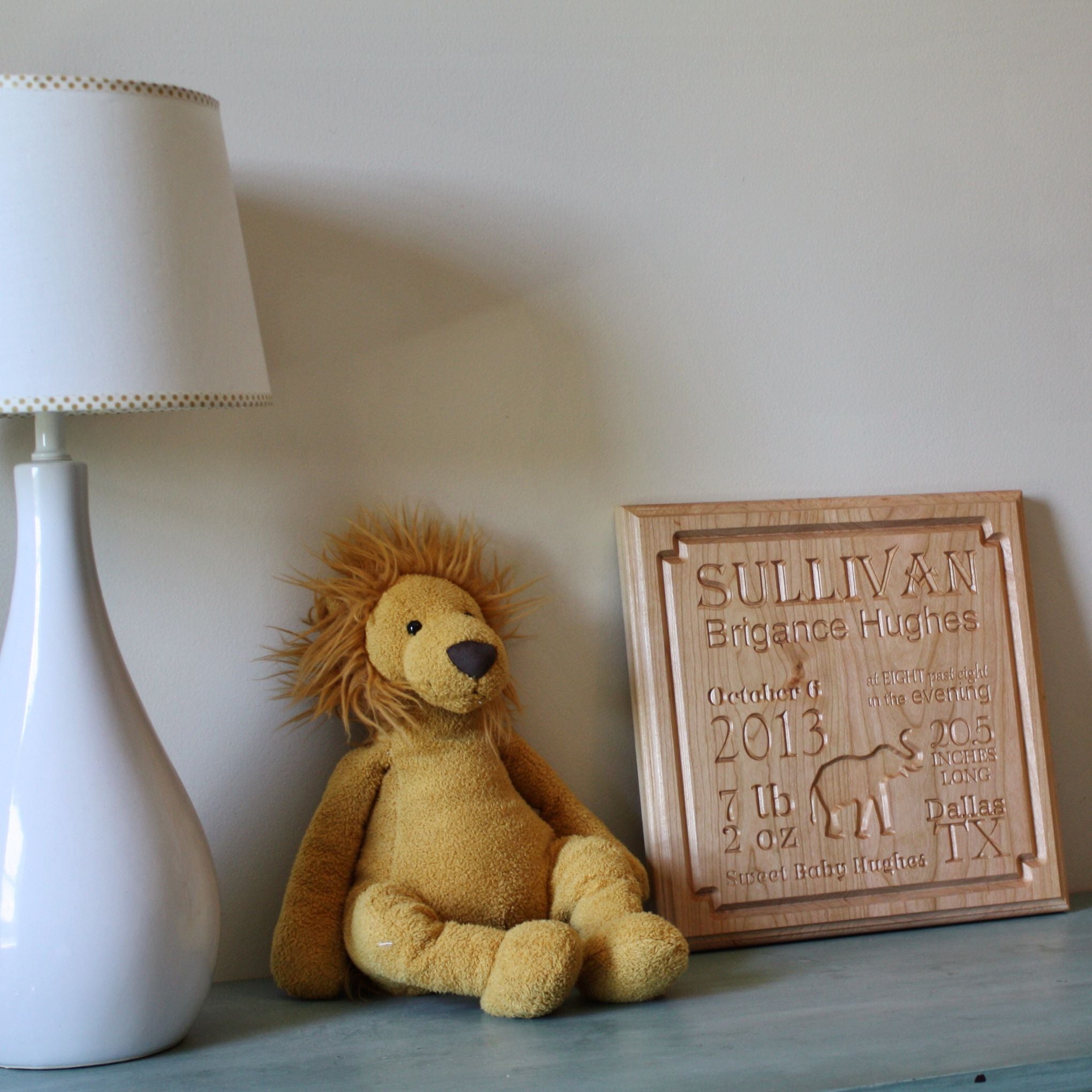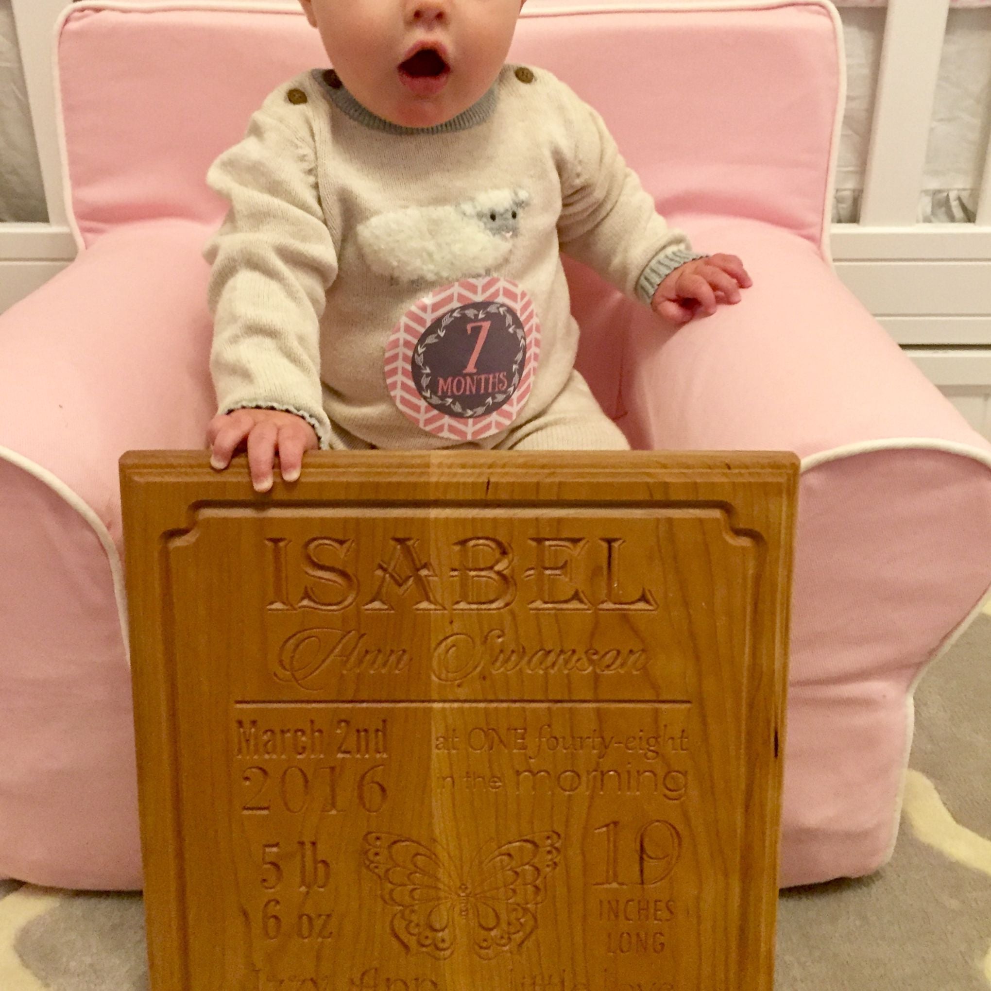 Finally, you get to choose a design for the center of the wooden nursery sign. The list includes a: butterfly, bear, giraffe, elephant, owl, or plane. You may also choose to only have the statistics to coordinate with your nursery decor.