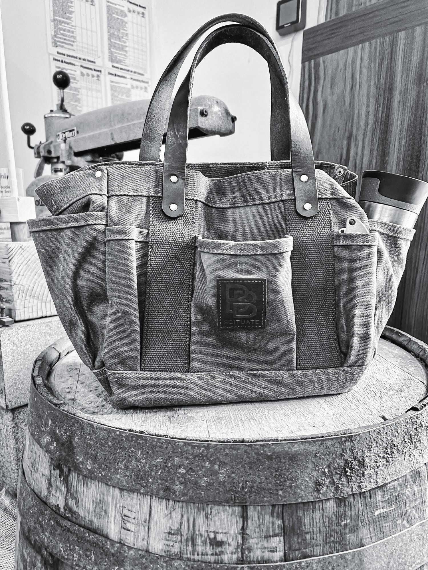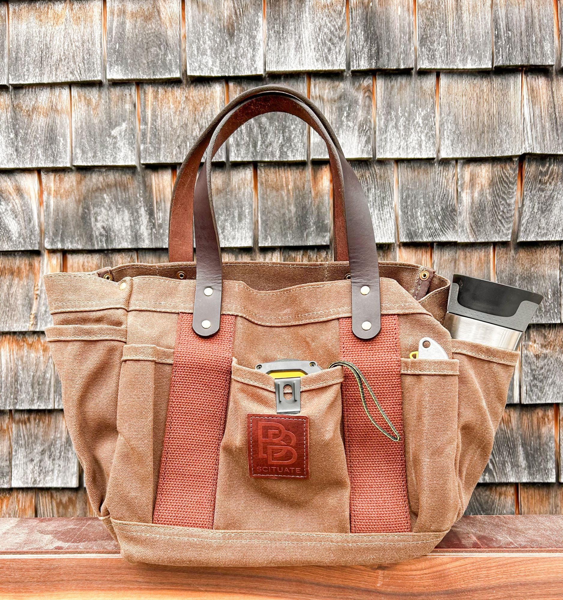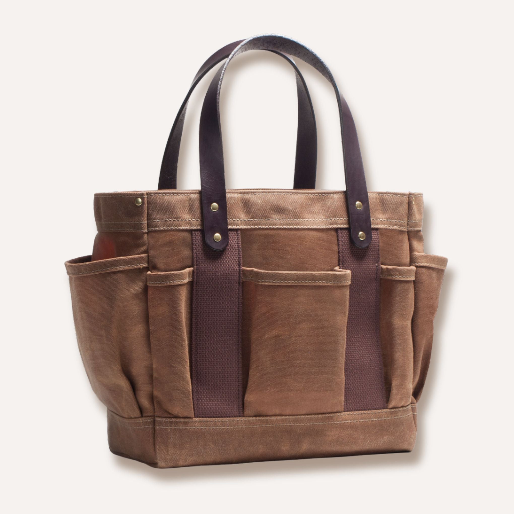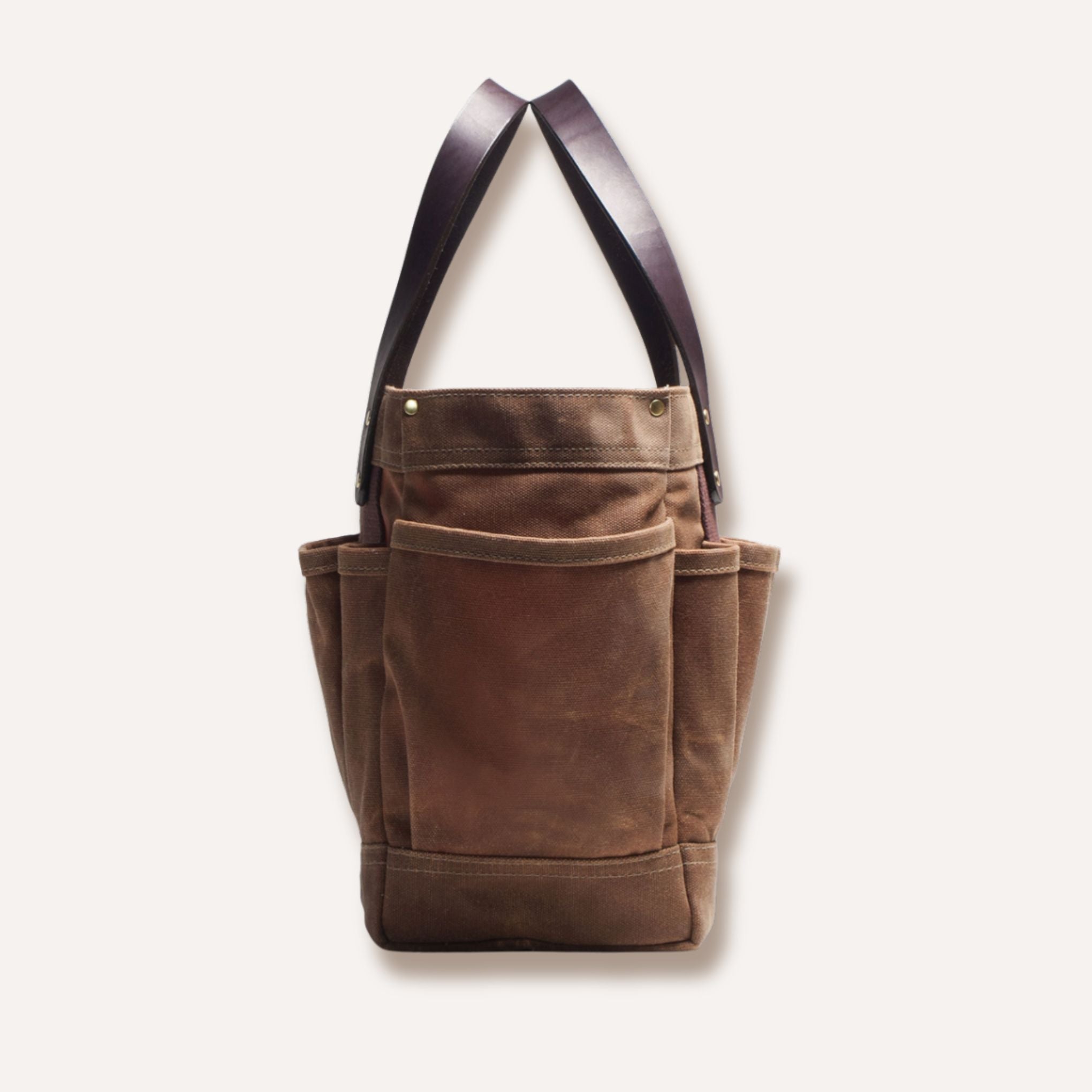 This BBD vintage 18oz. duck canvas and leather tote fits the work order. It's been dyed colorfast and treated with original Martexin™ water repellent wax. Brass rivets secure the bridle leather handle in place on reinforced cotton webbing. All seams are taped and double stitched as well as riveted at the top corners. A total of eight gusseted pockets allow for maximum organization. This bag is tough, brutally handsome and ideal for a variety of uses including gardening tote, crafts bag, artist tote, yacht bag, car trunk organizer or, our personal favorite, a weekend tool bag.
