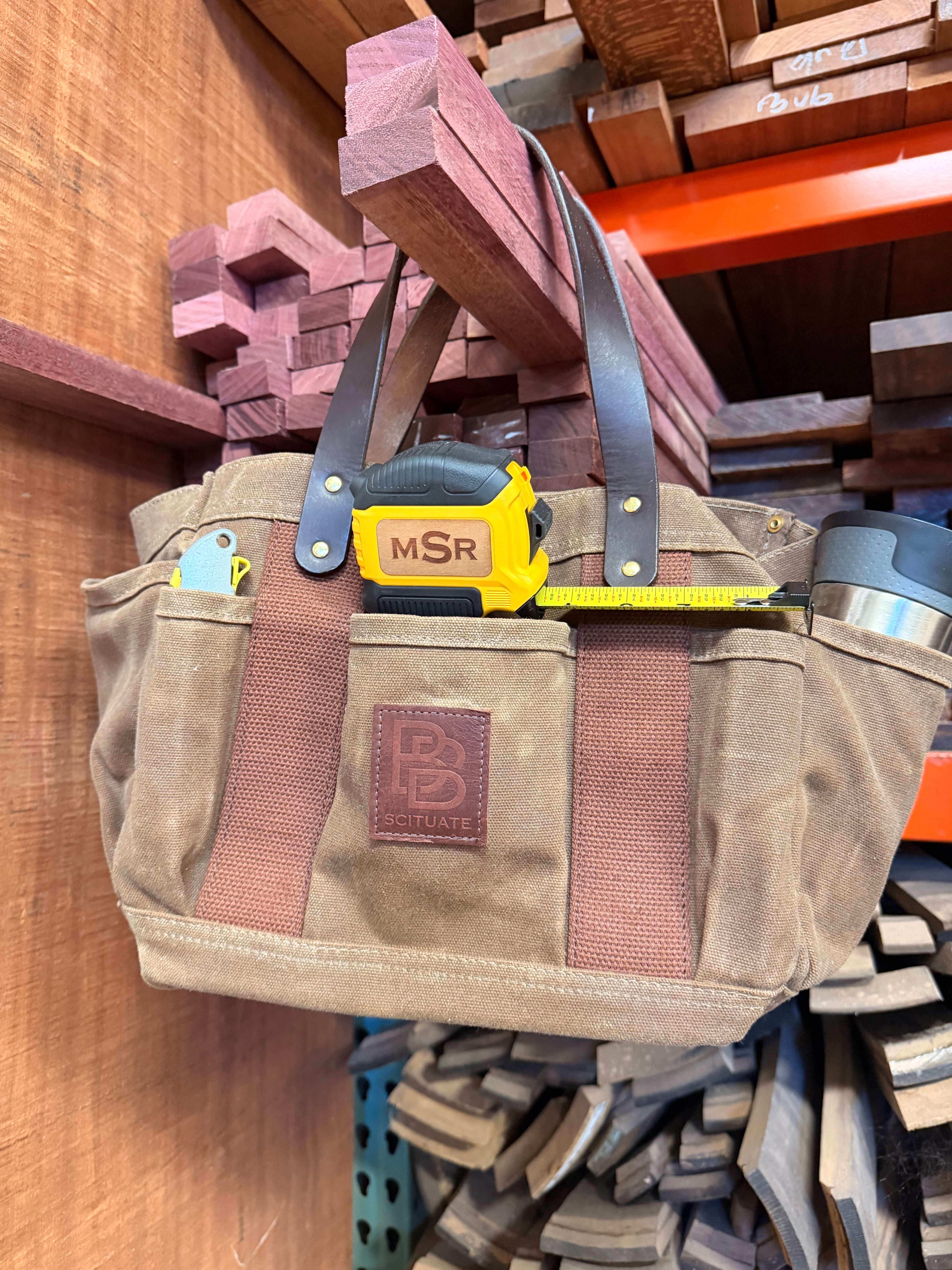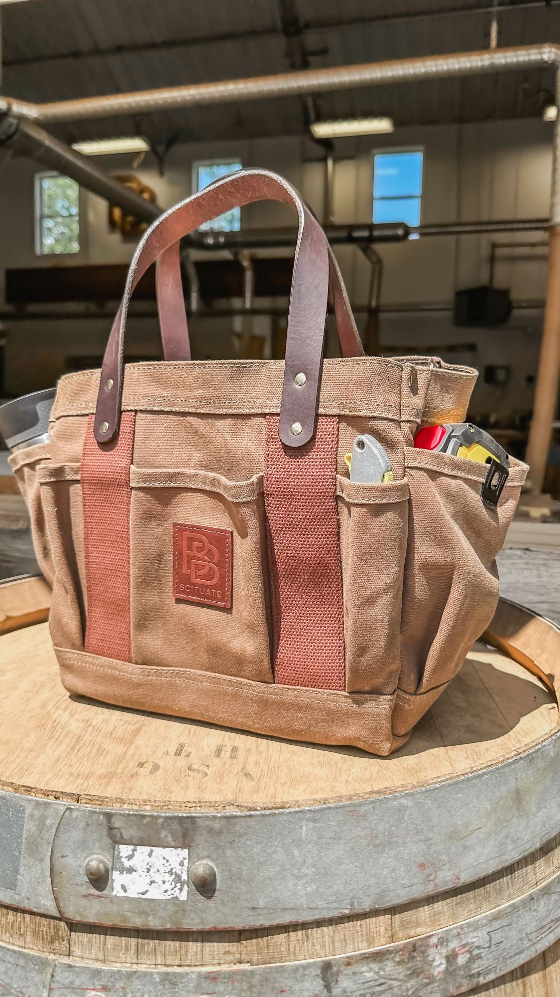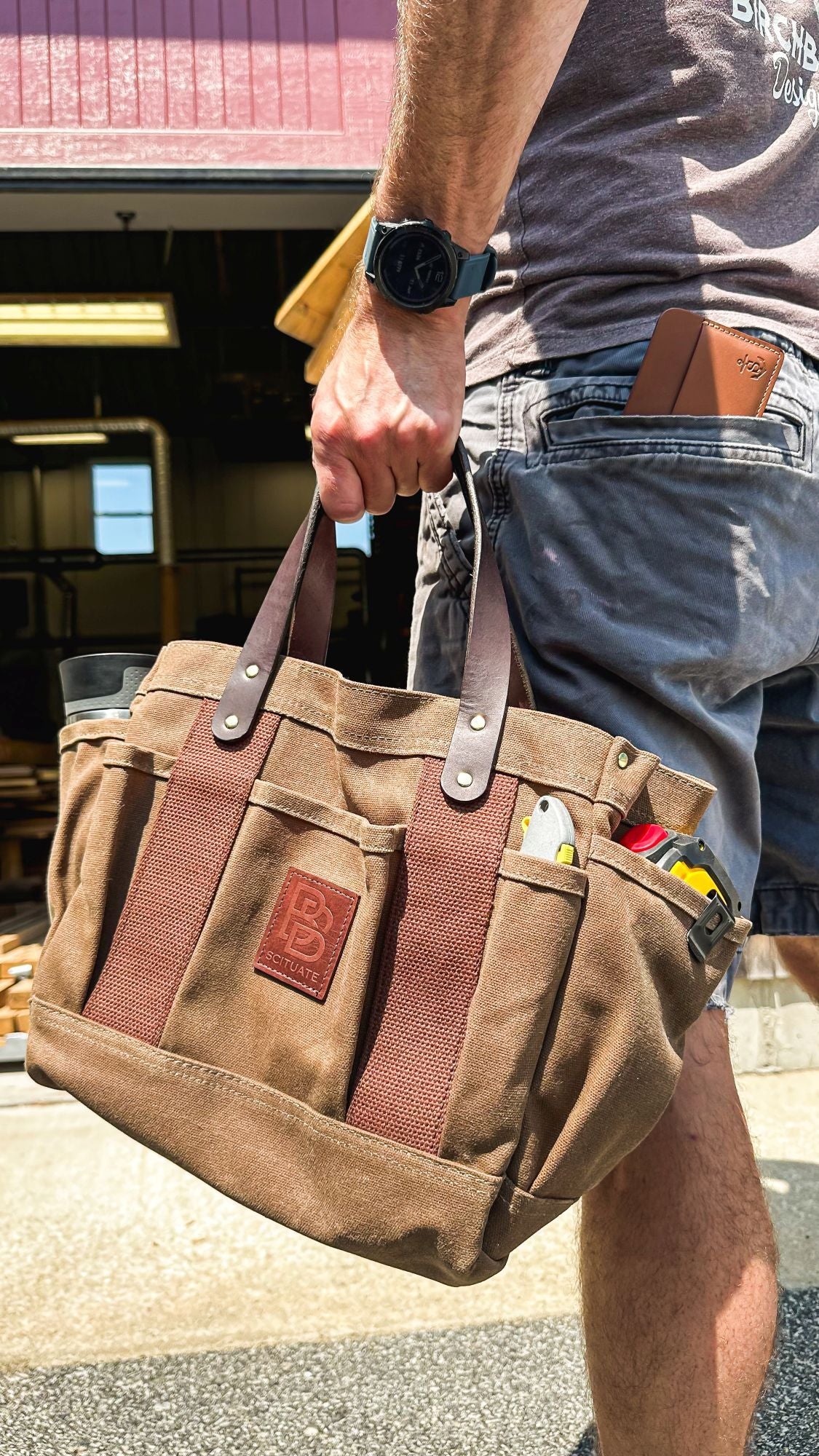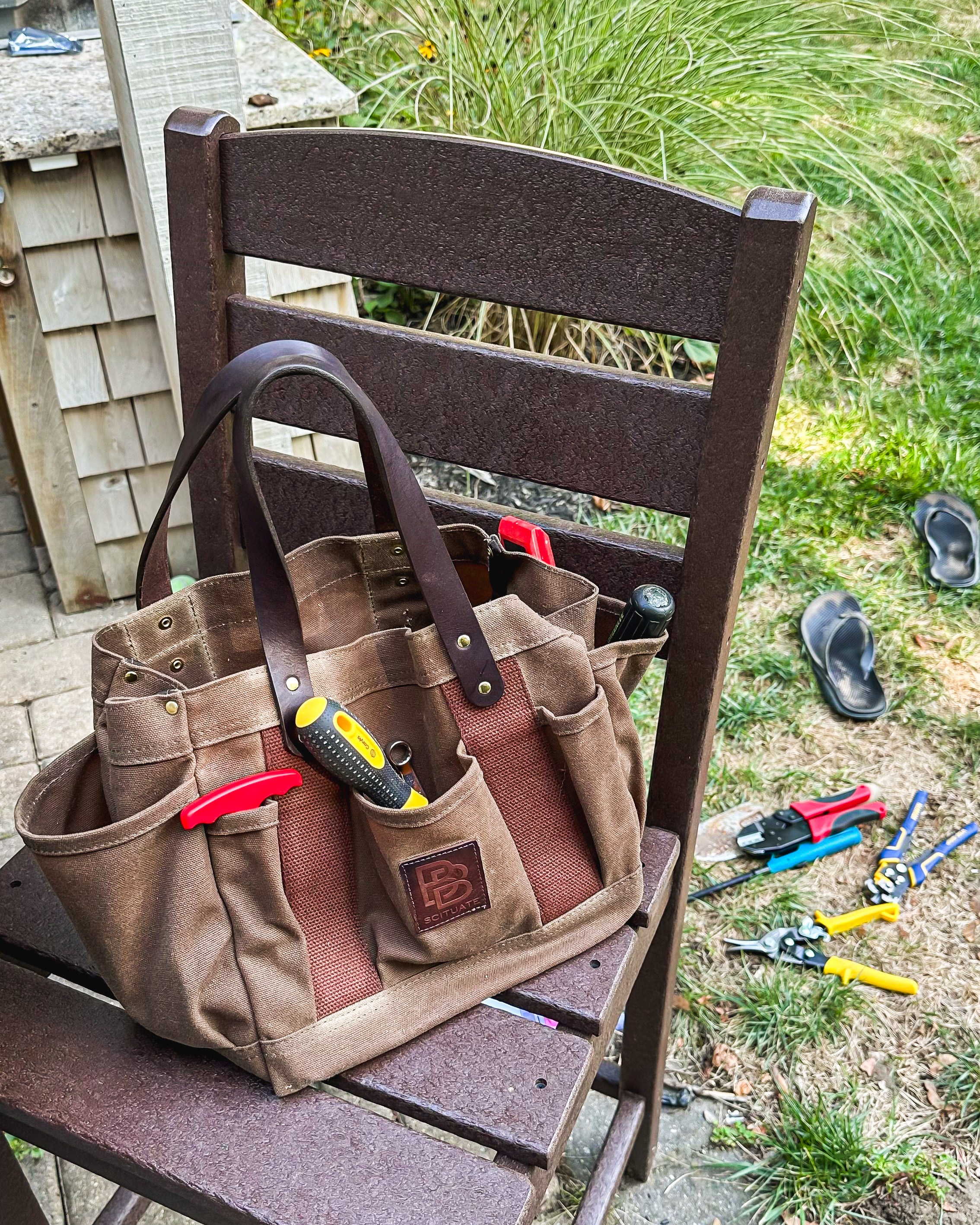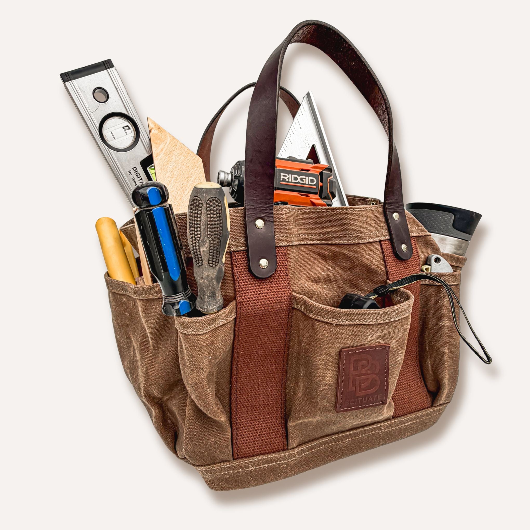 This BBD vintage 18oz. duck canvas and leather tote fits the work order. It's been dyed colorfast and treated with original Martexin™ water repellent wax. Brass rivets secure the bridle leather handle in place on reinforced cotton webbing. All seams are taped and double stitched as well as riveted at the top corners. A total of eight gusseted pockets allow for maximum organization. This bag is tough, brutally handsome and ideal for a variety of uses including gardening tote, crafts bag, artist tote, yacht bag, car trunk organizer or, our personal favorite, a weekend tool bag.