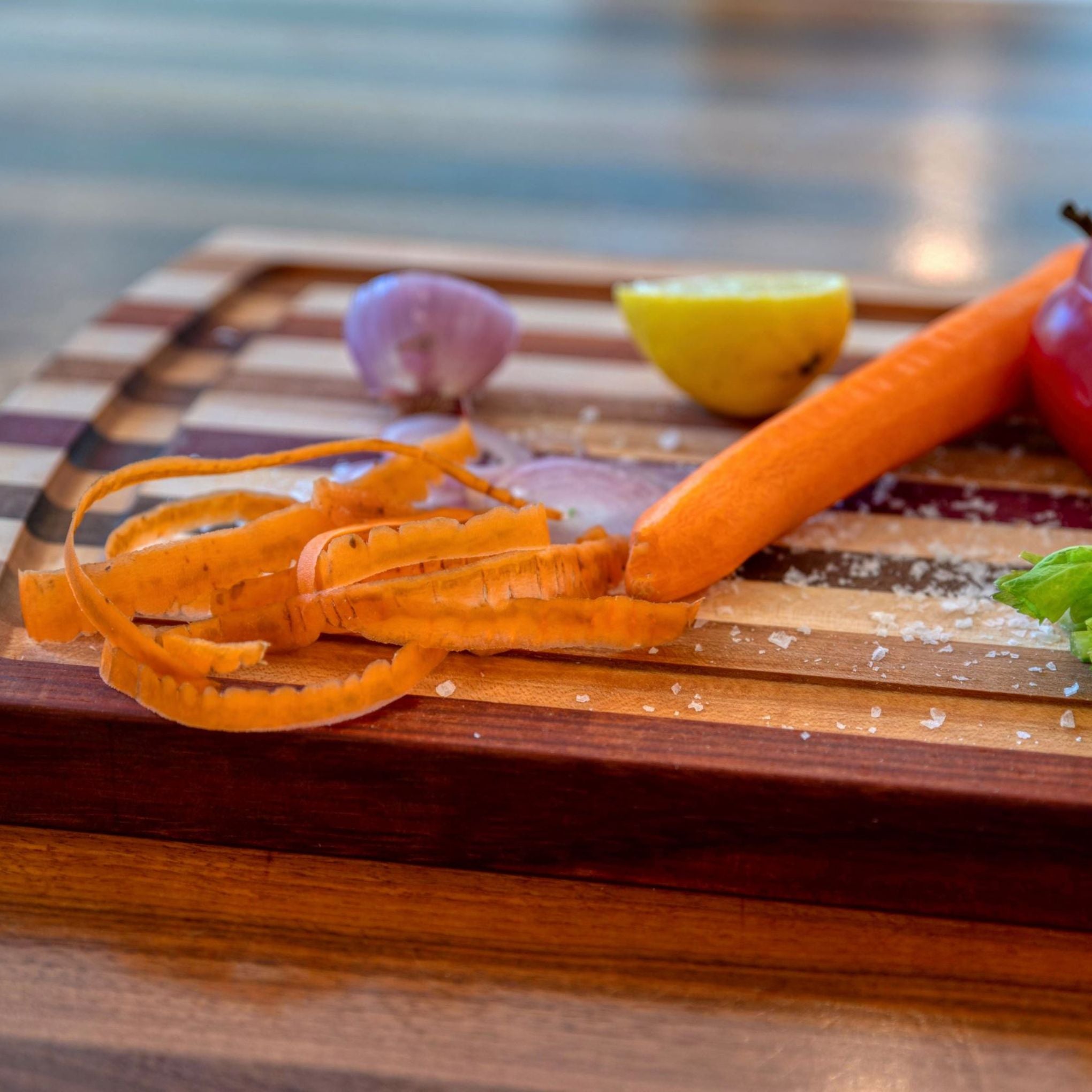We took our staple edge-grain cutting board in our trademark Original pattern and made it better. We altered the board's surface area just enough to comfortably handle and prep on.