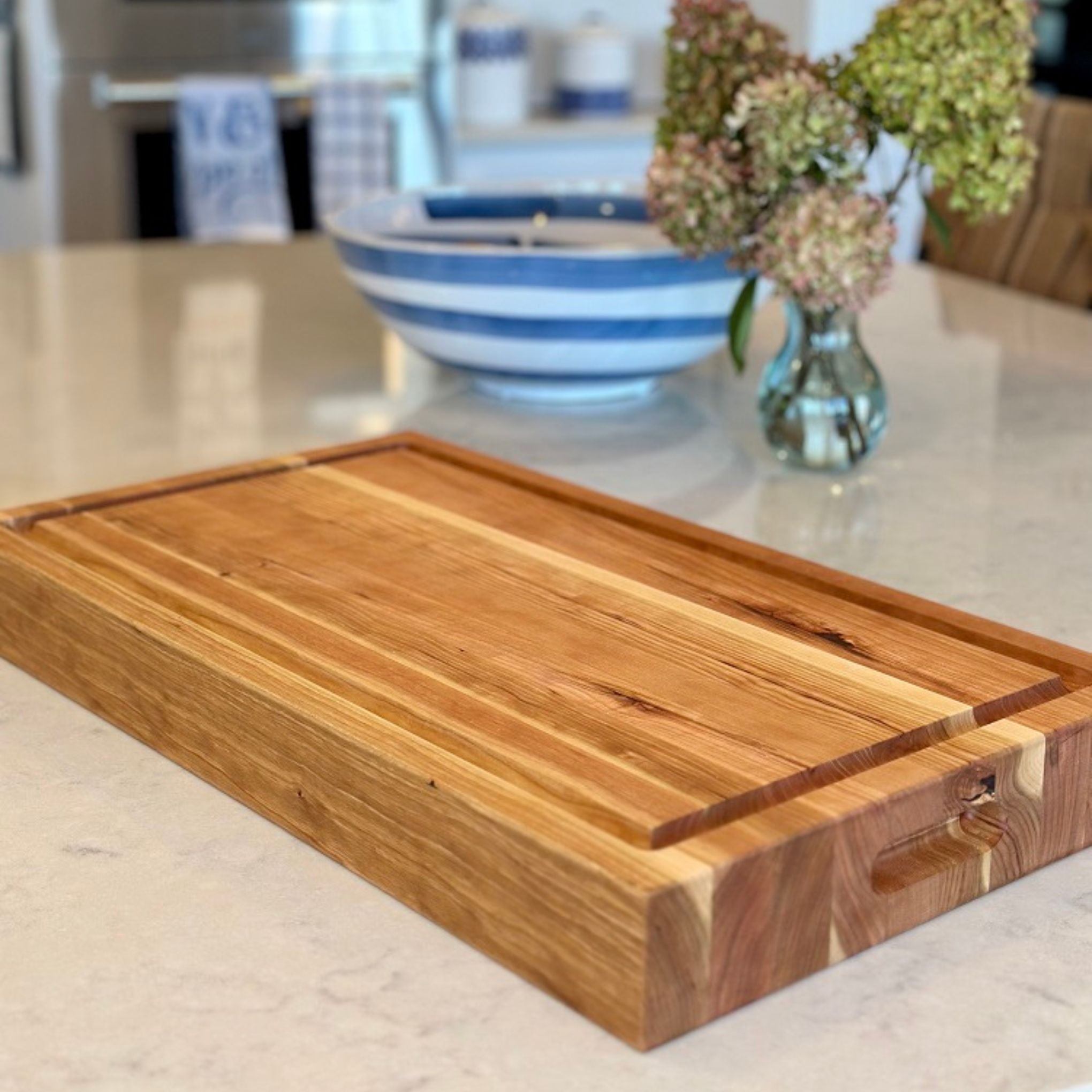 The more cherry wood, the better! We can’t get enough of the beautiful grain in our extra-large cherry cutting board. The material has a lot of unique heart wood and sap wood details that are unlike other hardwoods we use.