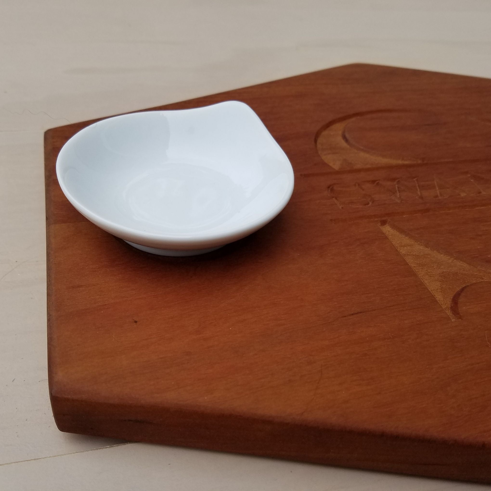 It’s a uniquely shaped charcuterie board that sets it apart from the pack as no simple serving board. Your cheeses and hors-d’oeuvres will be flanked by two porcelain ramekins to fill with dipping sauces or extra goodies.
