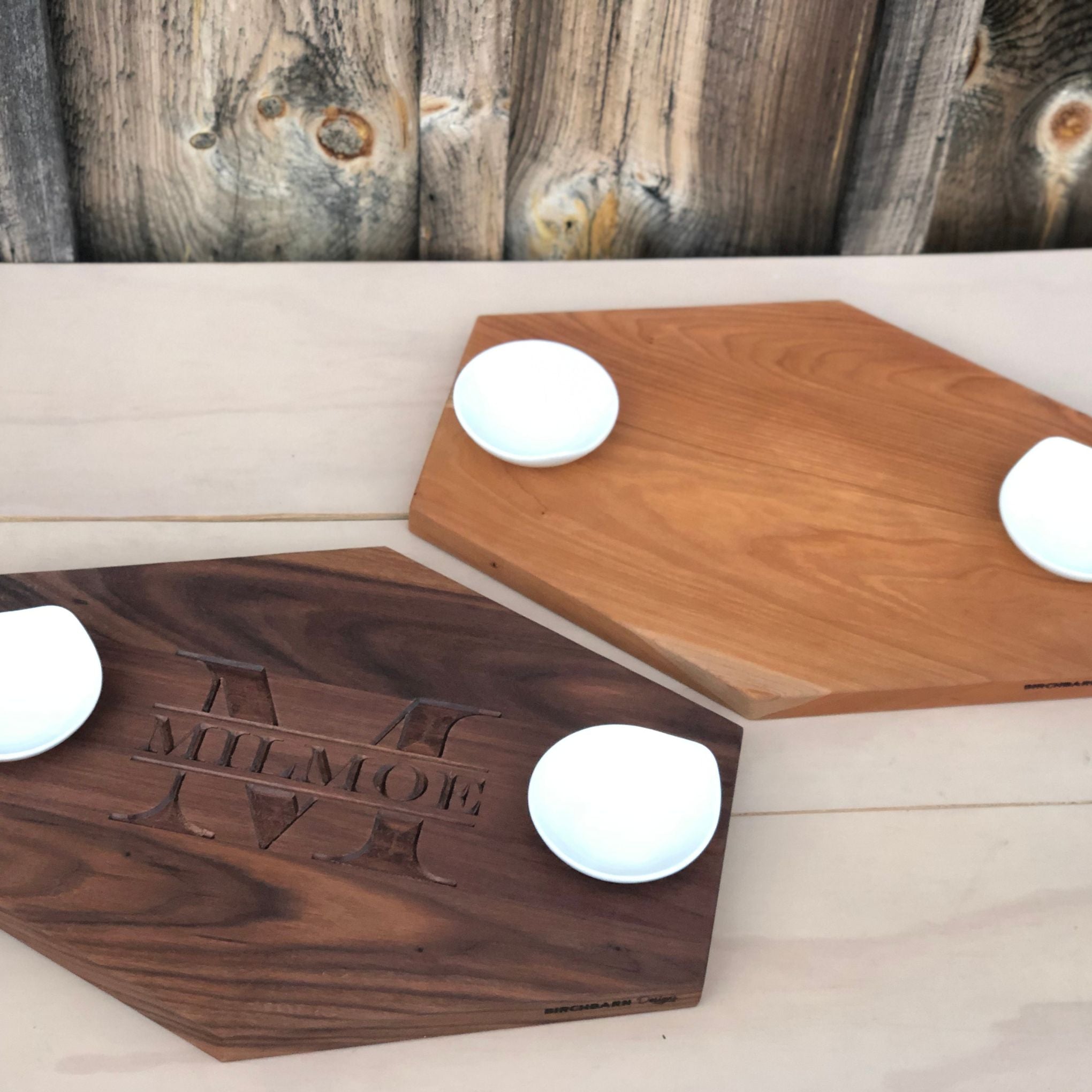 Choose to further customize your board with a monogram or special text to create a remarkably meaningful gift. As you can see in the example photos, a classic engraving that our customer’s love is a big singular letter with the name striped across. The engraving, the dishes, and the grain come together to create a symmetrically shaped charcuterie board.
