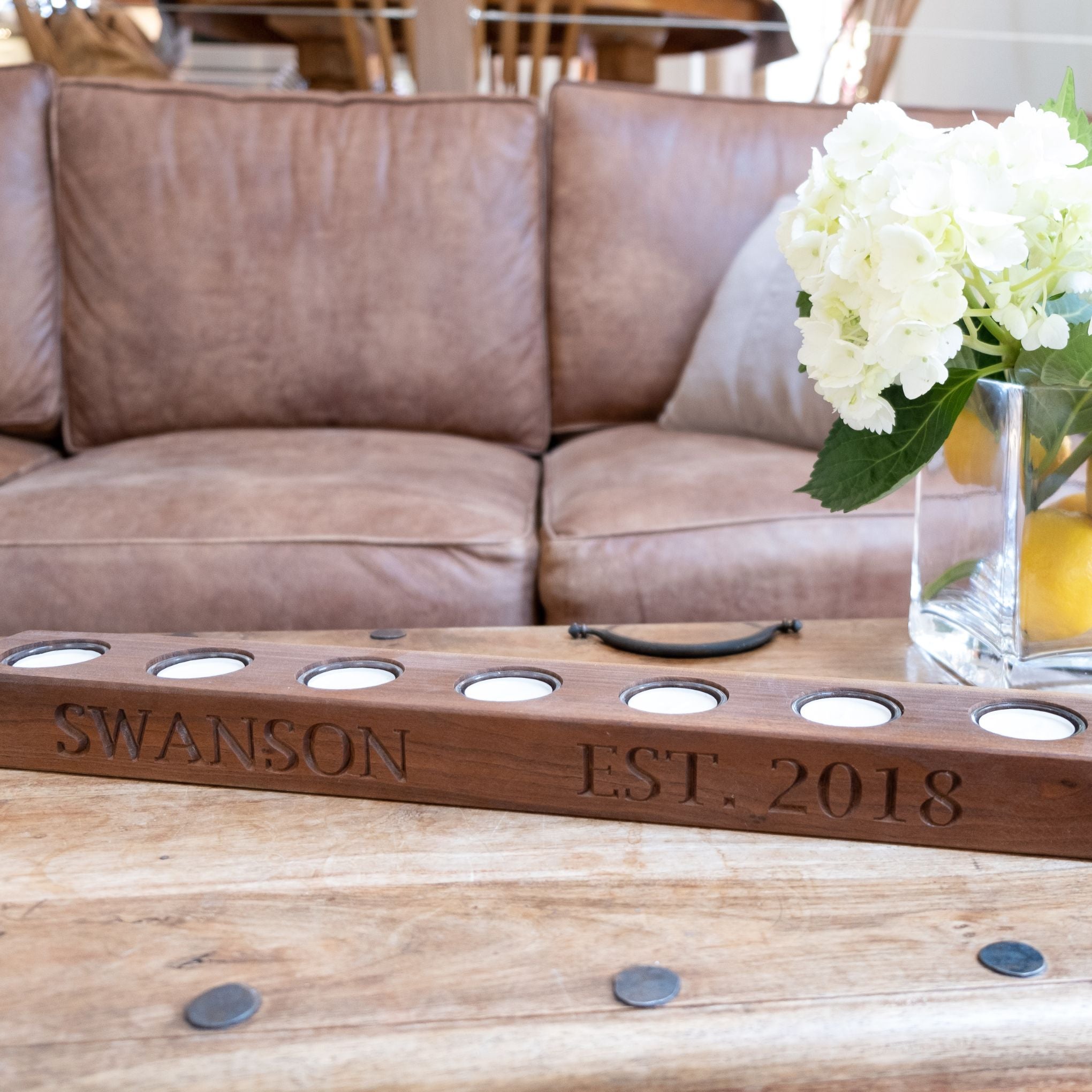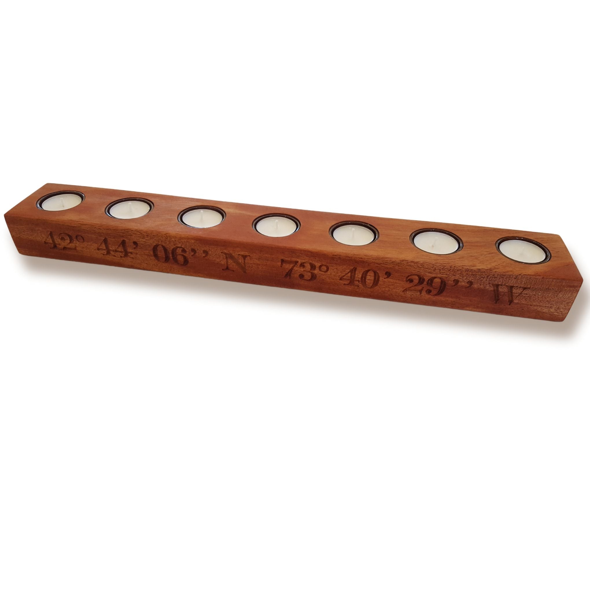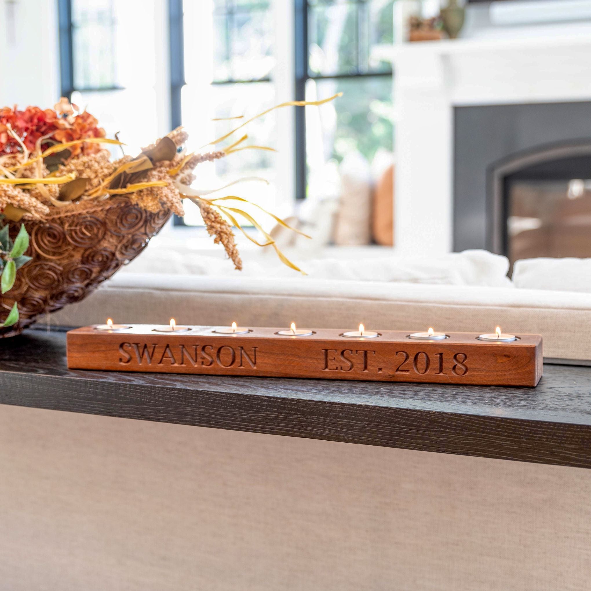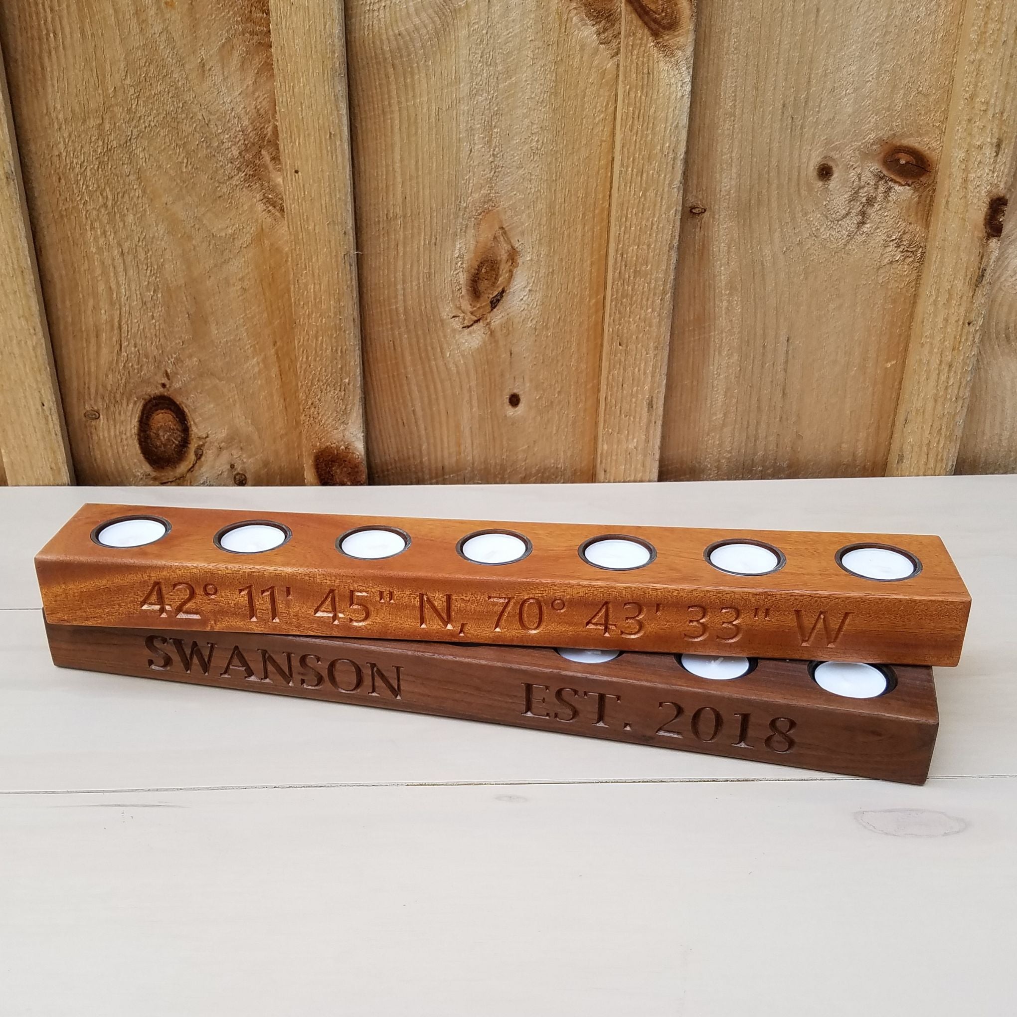 The wood candle holder has plenty of room to engrave on the front. You can choose to engrave the back side as well for an extra $15. Choose to engrave the tea light holder with a last name, favorite quote, wedding date, or GPS coordinates (in case you forget when you were married or where you live…no judgments).