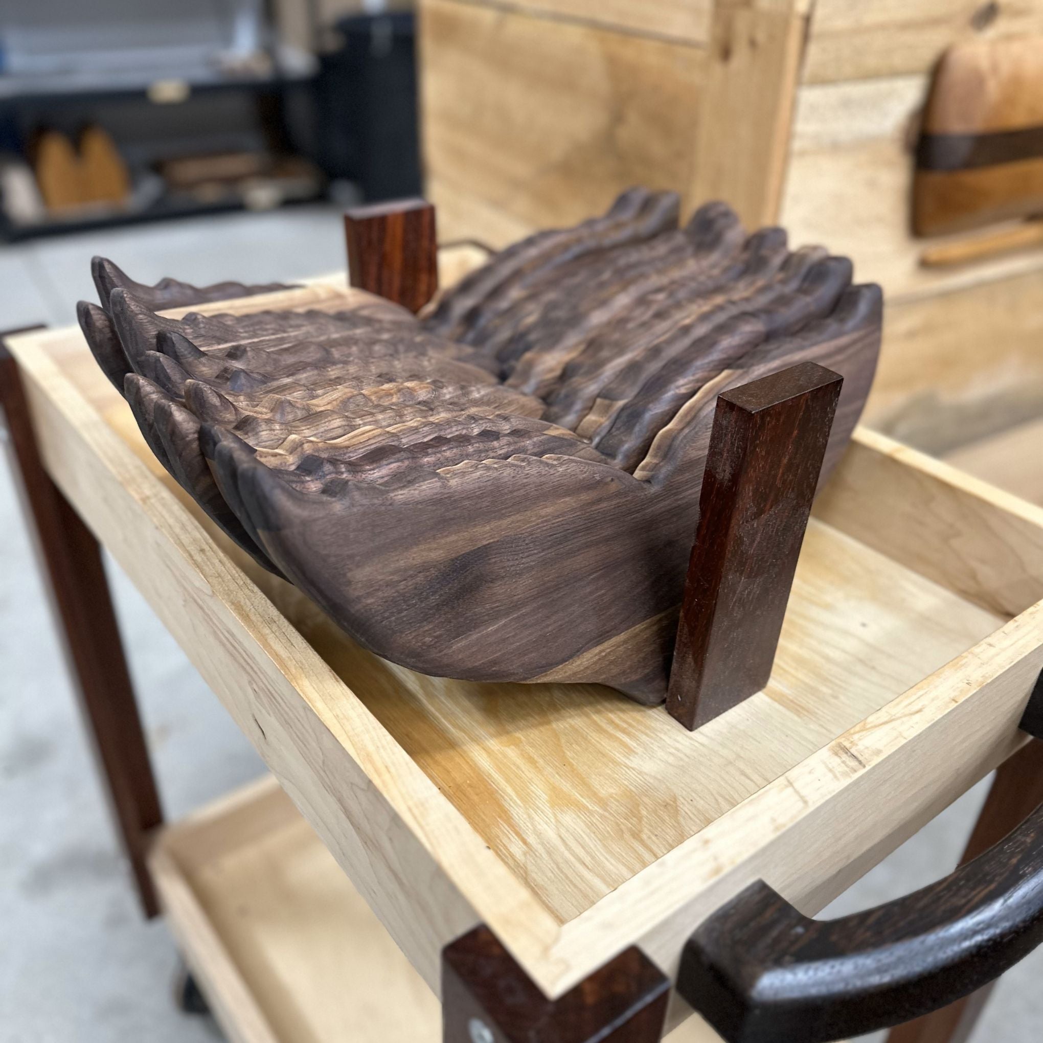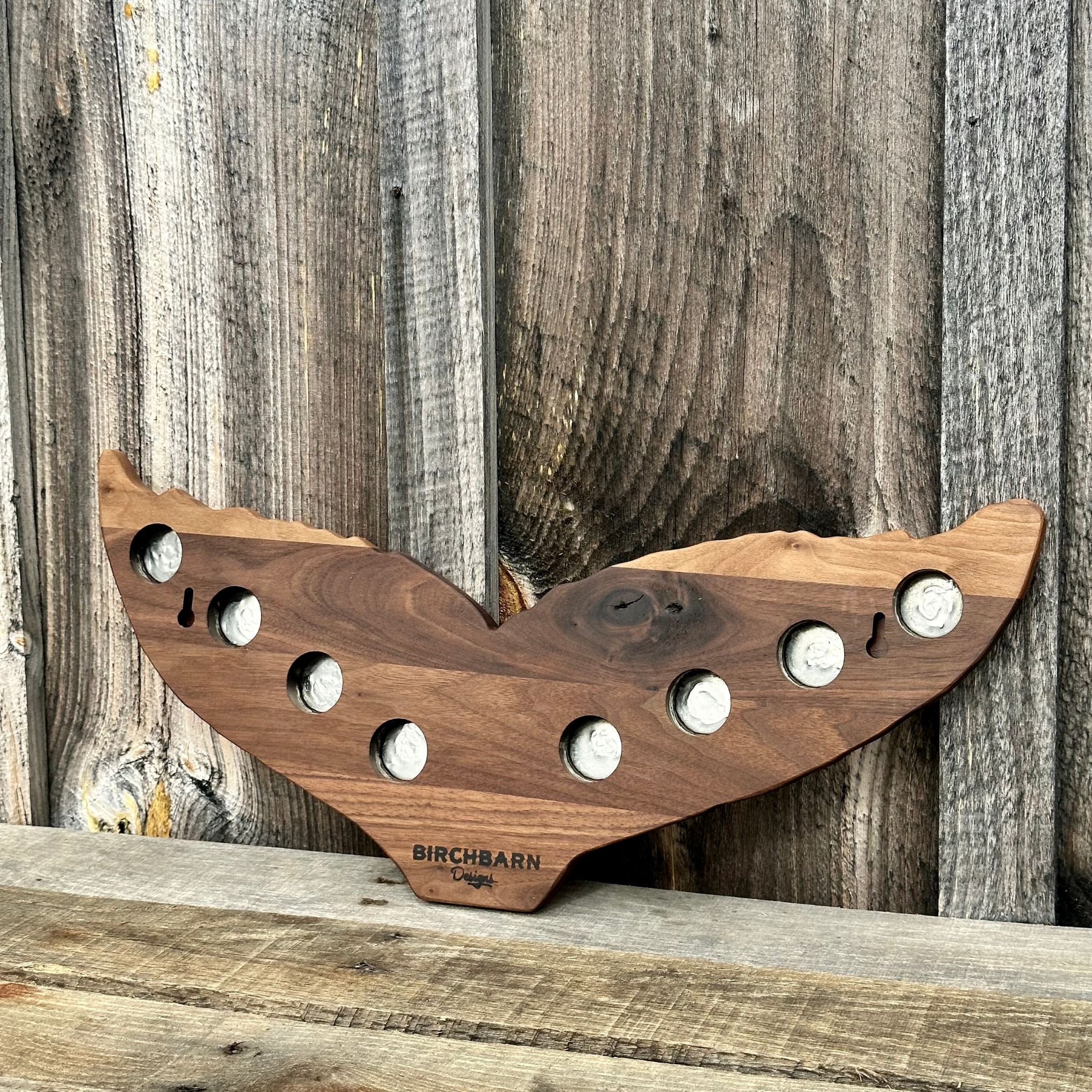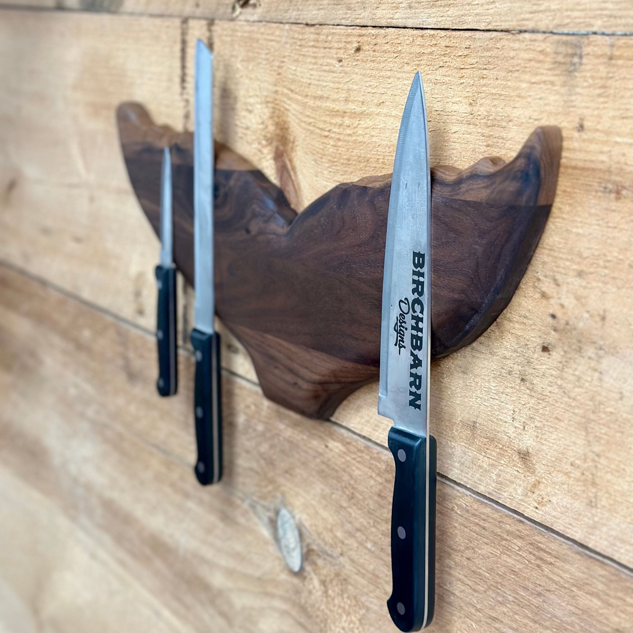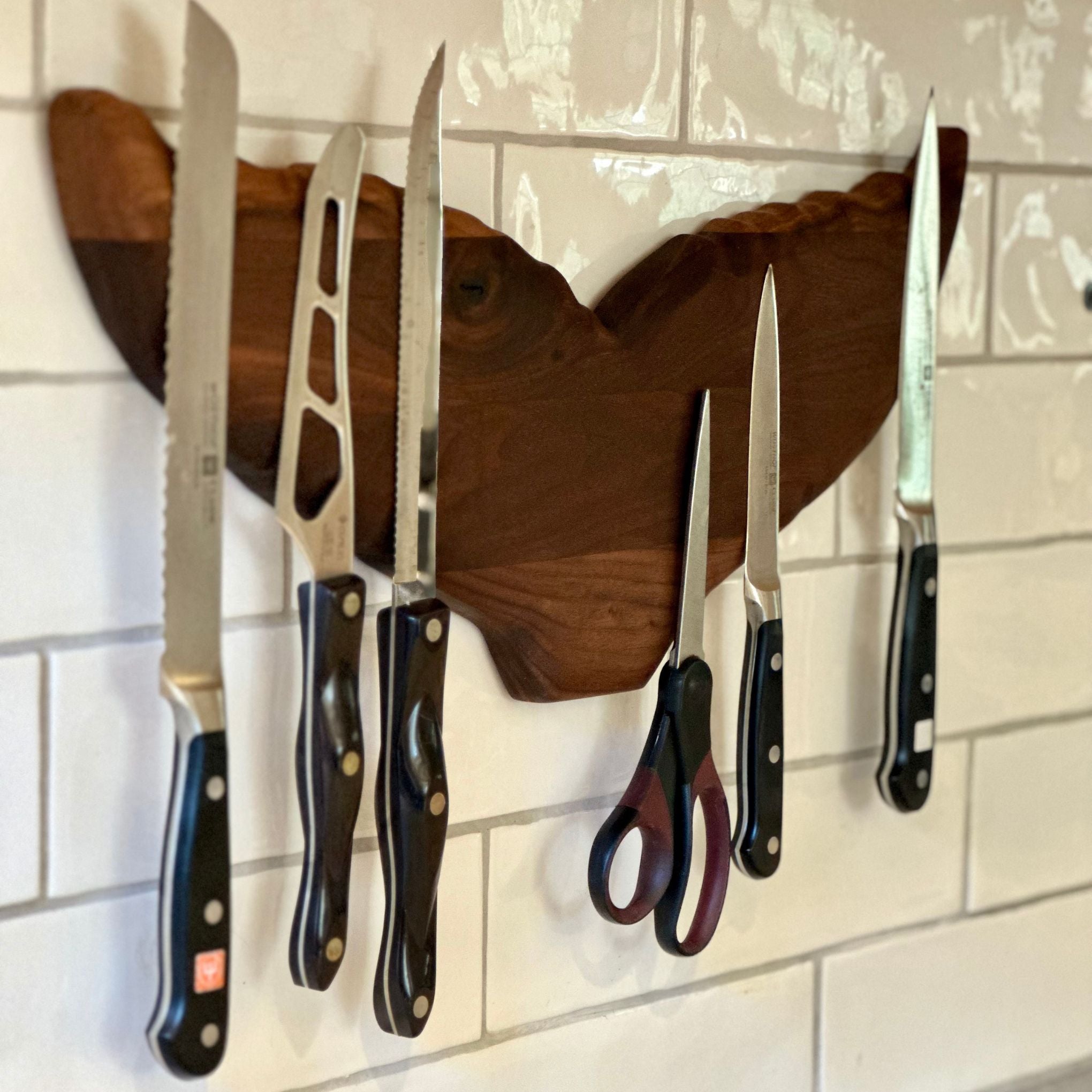 We carved a 3-dimensional whale fluke using Black Walnut wood, and inlaid magnets on the back for a seamless design. Not only is it stylish, but the magnetic mount can also grasp 8 knives or other metal tools, like kitchen shears, bottle openers, or tongs, making it a handy place to store your metal kitchenware.