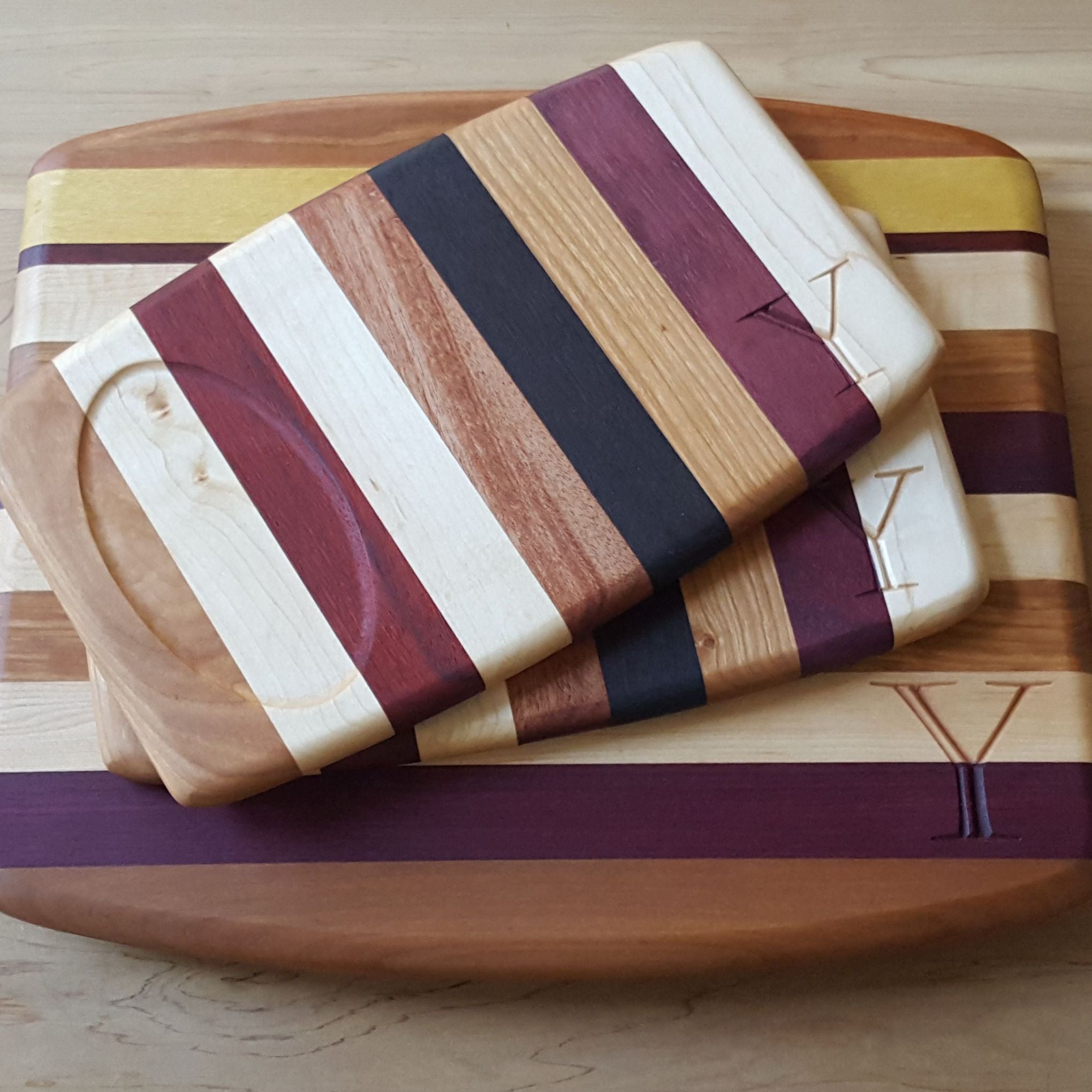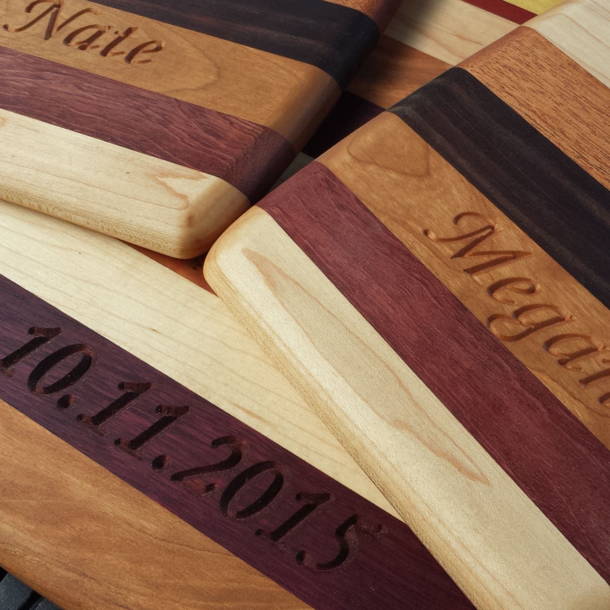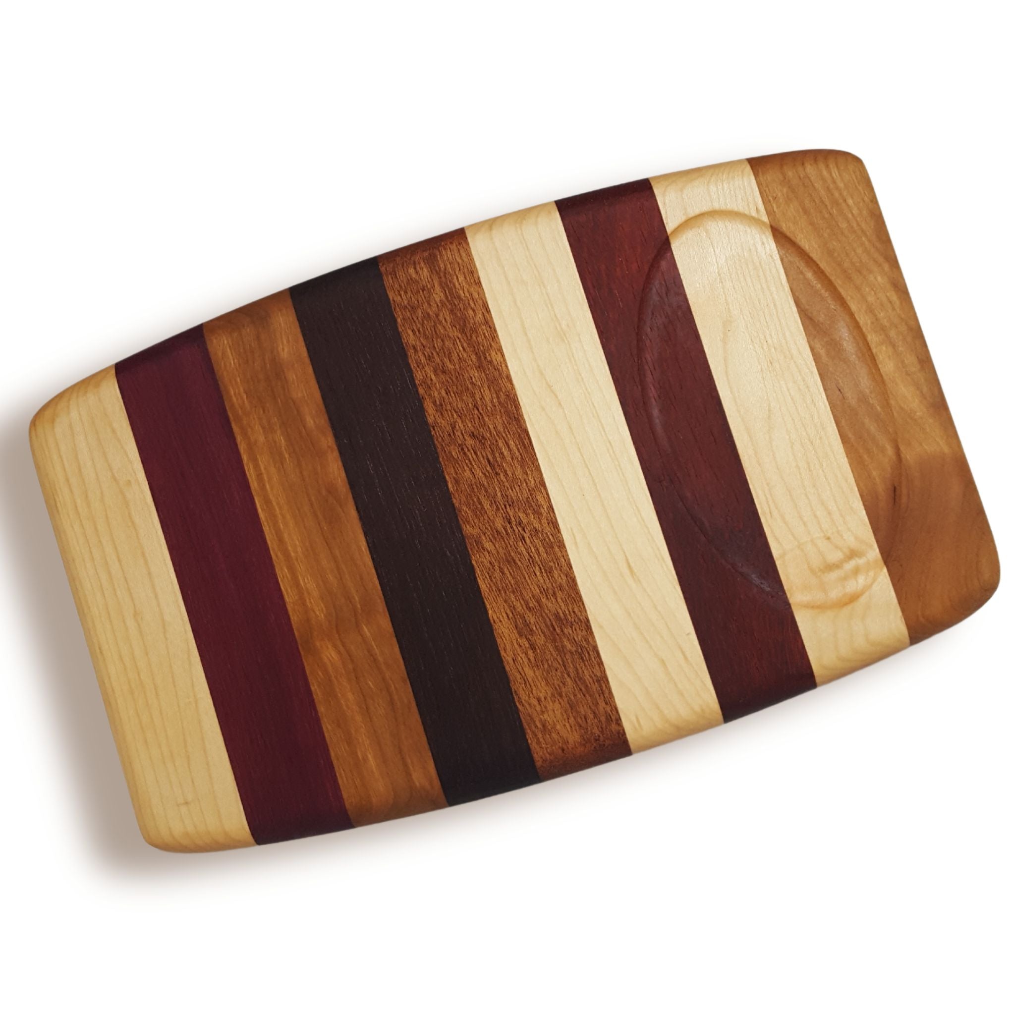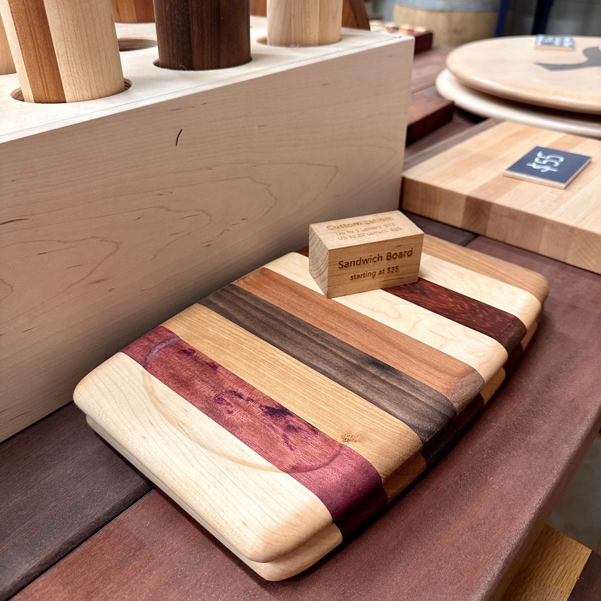 To complement the perfect sandwich, steak, sushi roll, or other meal, we made the wooden sandwich board using a collection of colorful hardwoods. We even added a recessed area for your chips or veggies.
