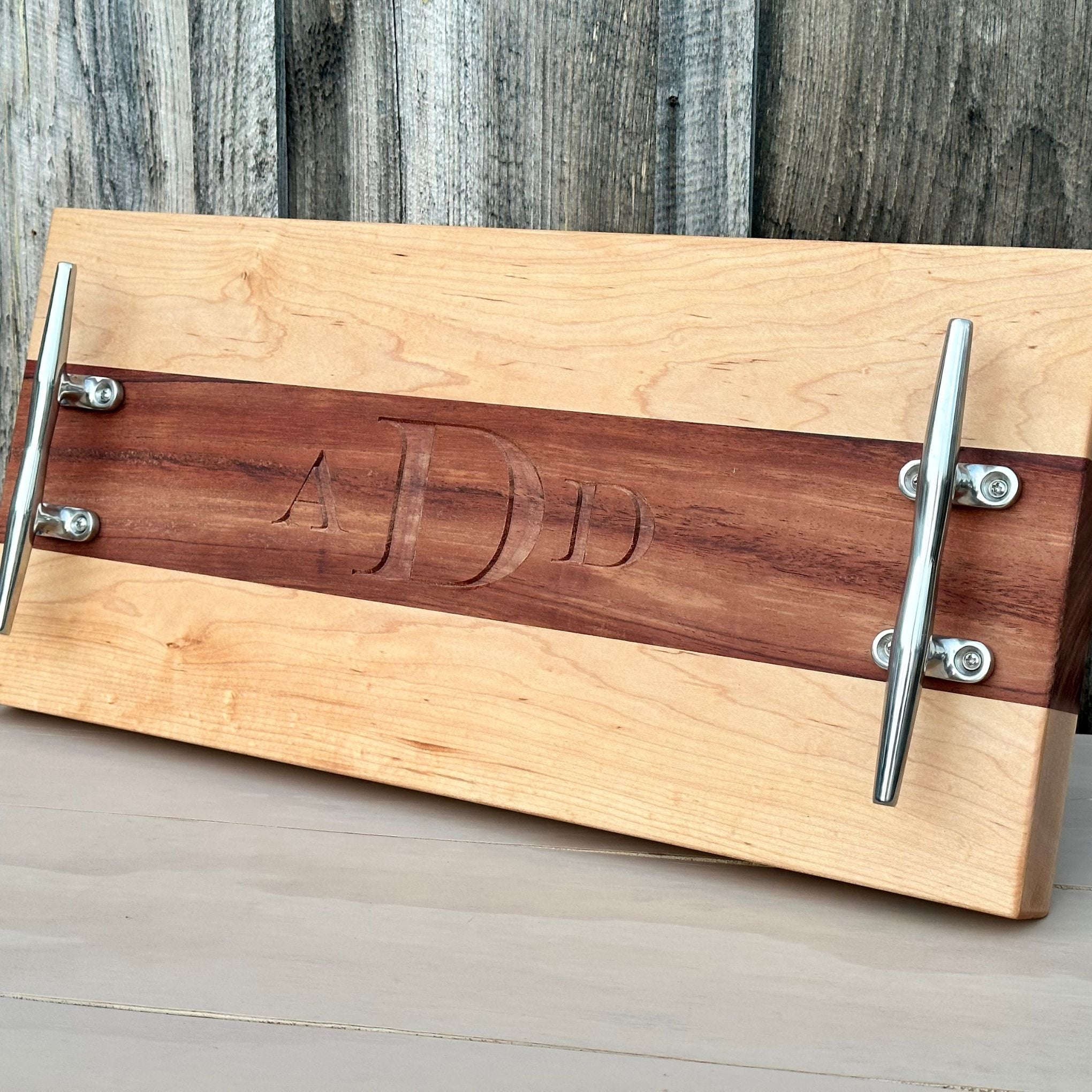 Show off your Nauti side with an extra-large wood serving board, featuring two 8″ stainless steel boat cleats as handles.