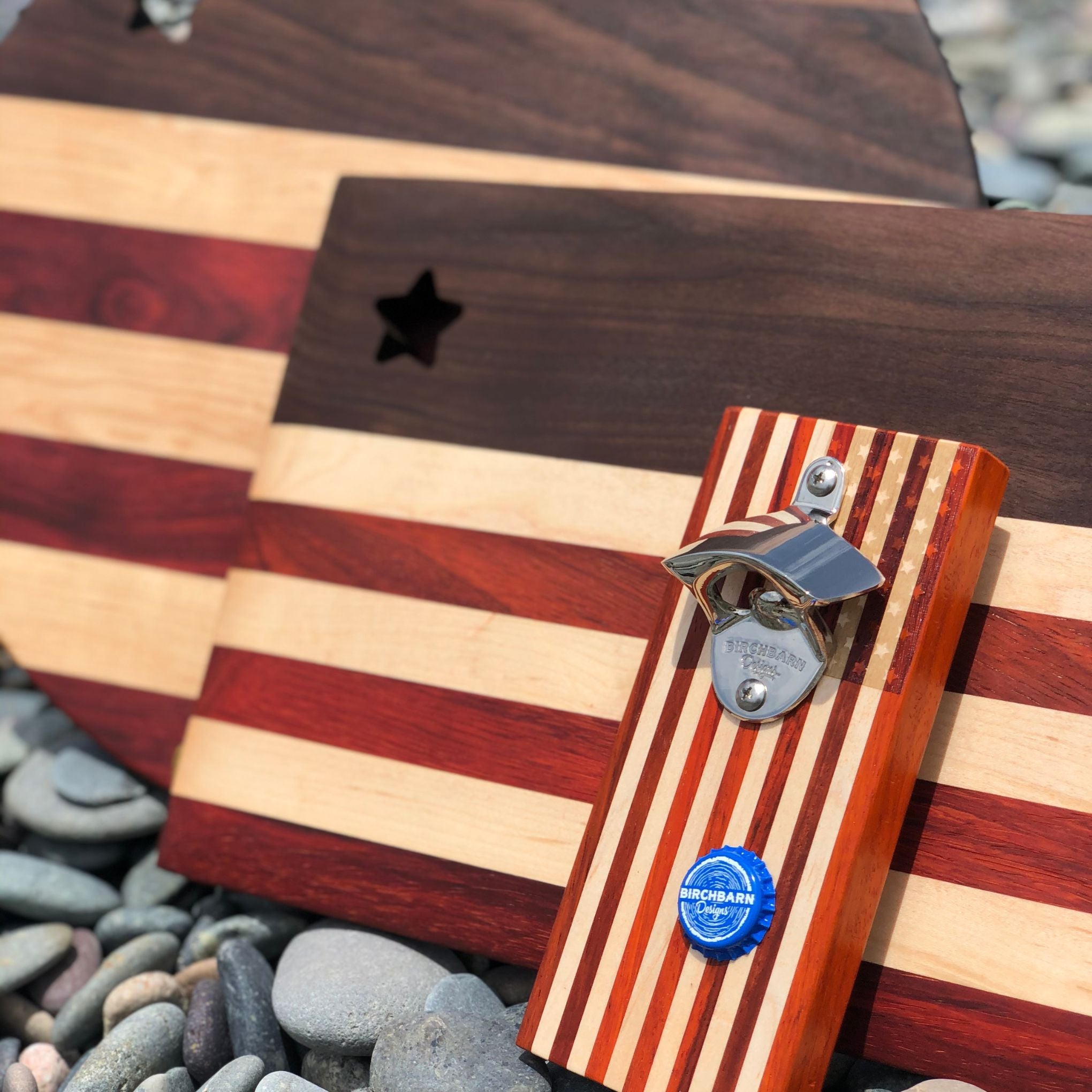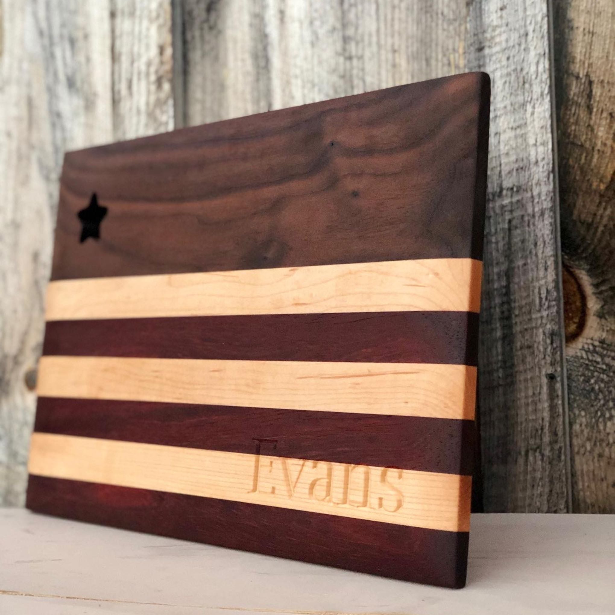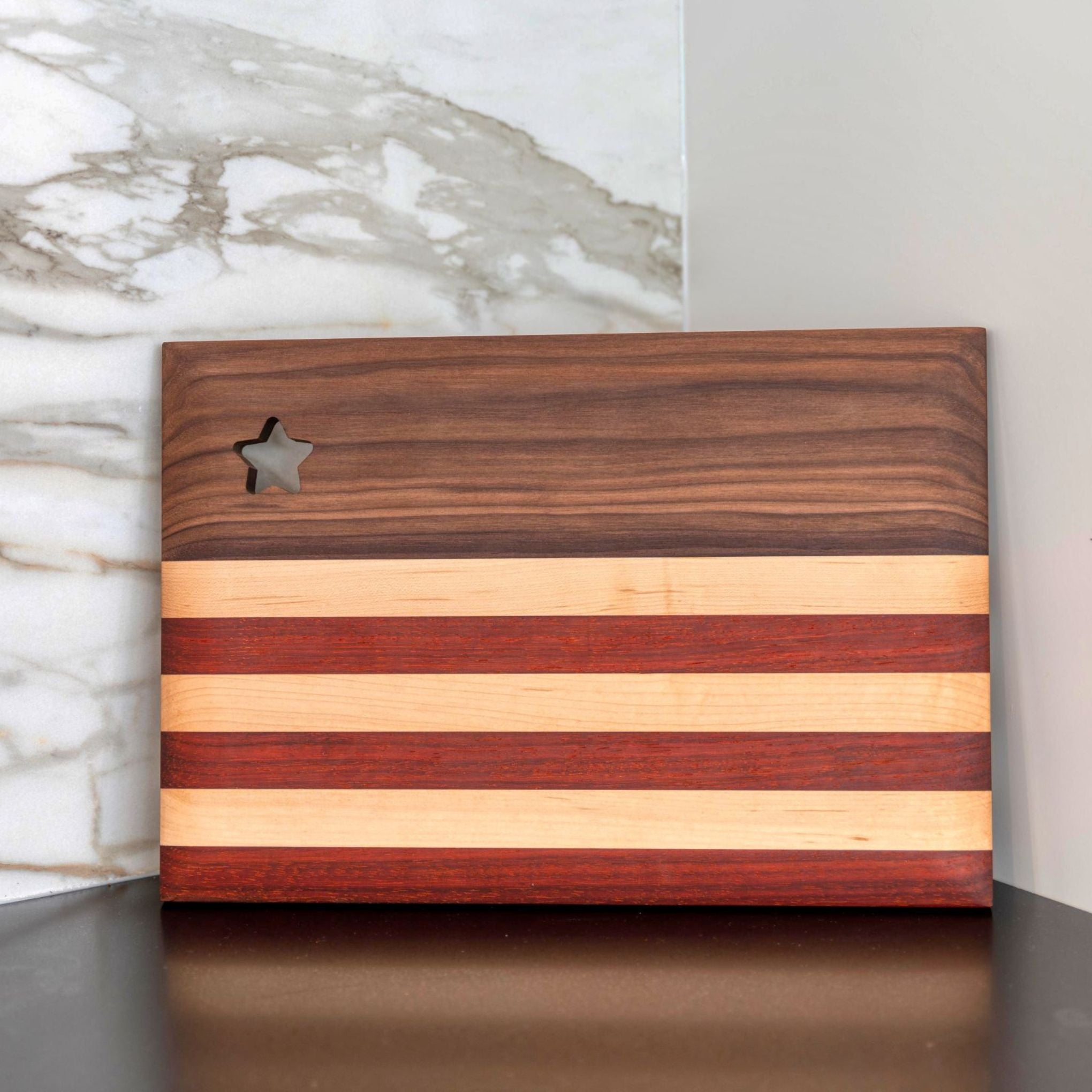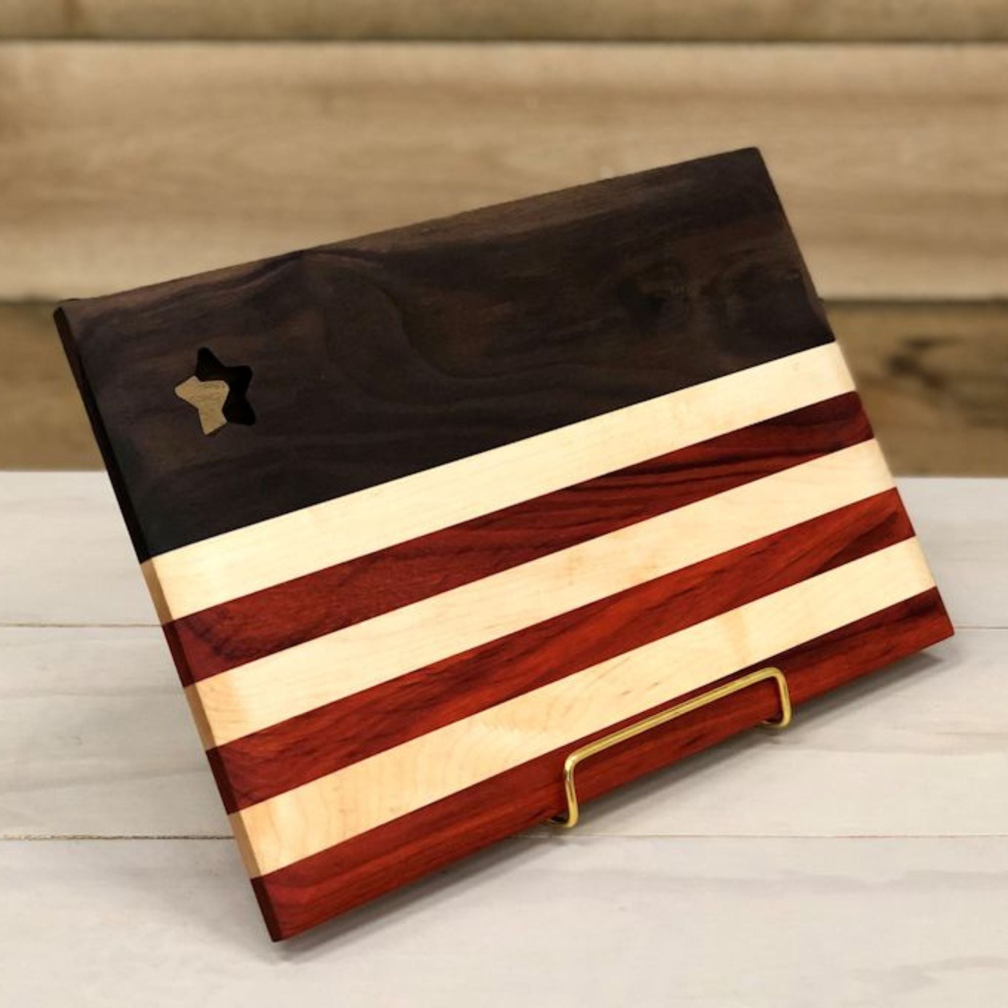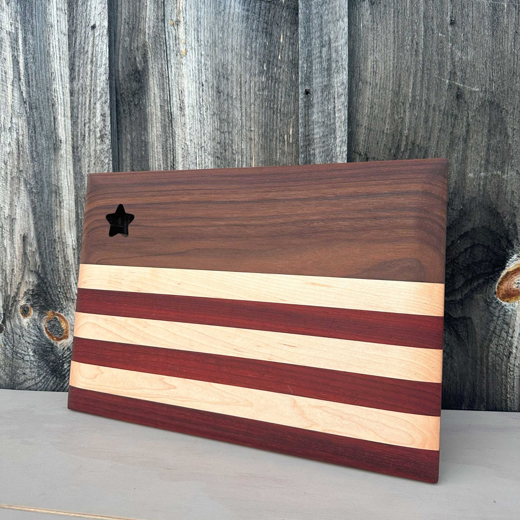The Old Glory serving board measures 10″ x 15″ and showcases rich walnut wood, along with alternating strips of maple and padauk to represent the stripes of the American Flag. The star cutout is a decorative accent that makes the board truly shine.