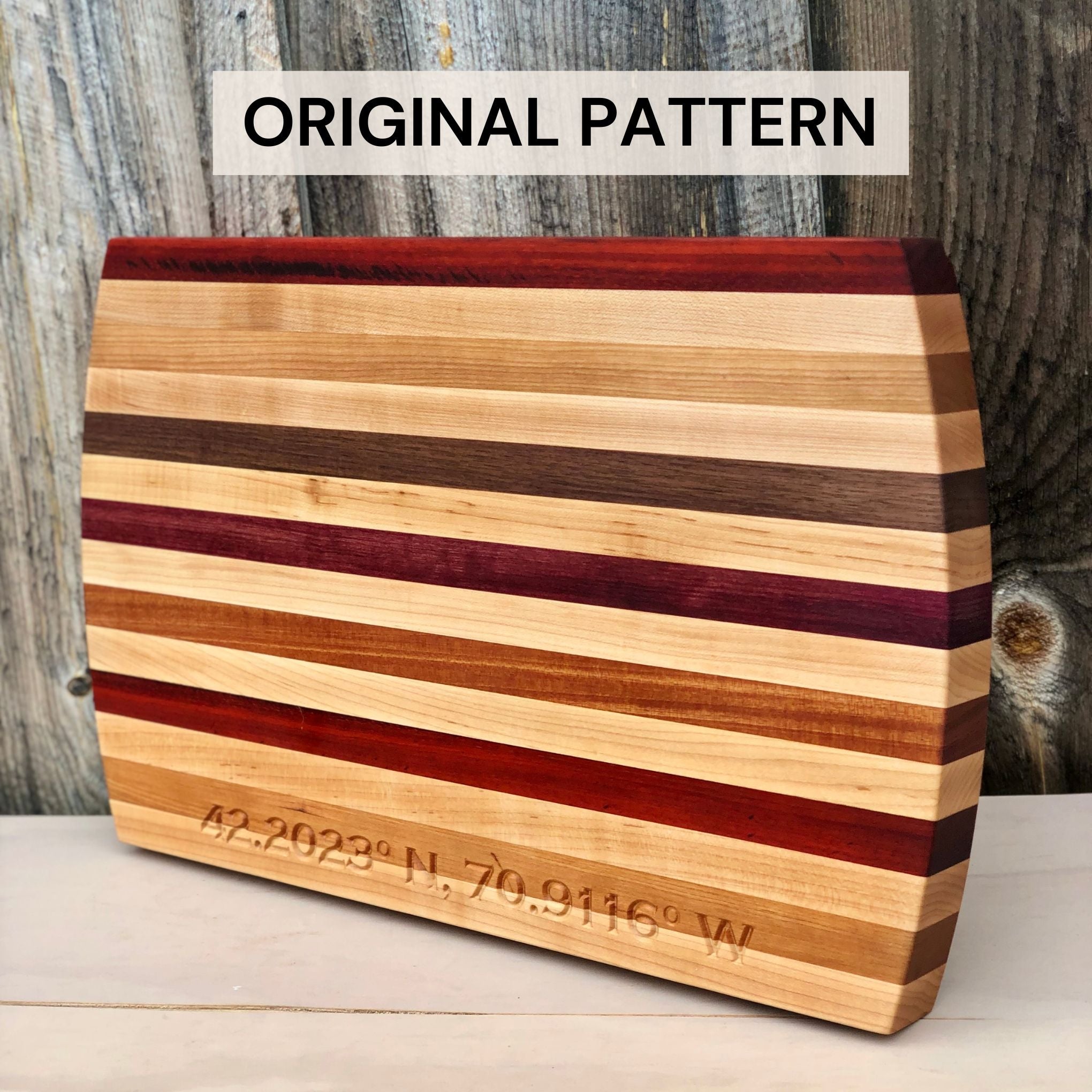 First, is our unforgettable Original Pattern. Made of exotic hardwoods that alternate with hard maple, creating a striped cutting board look. See if you can name them all!