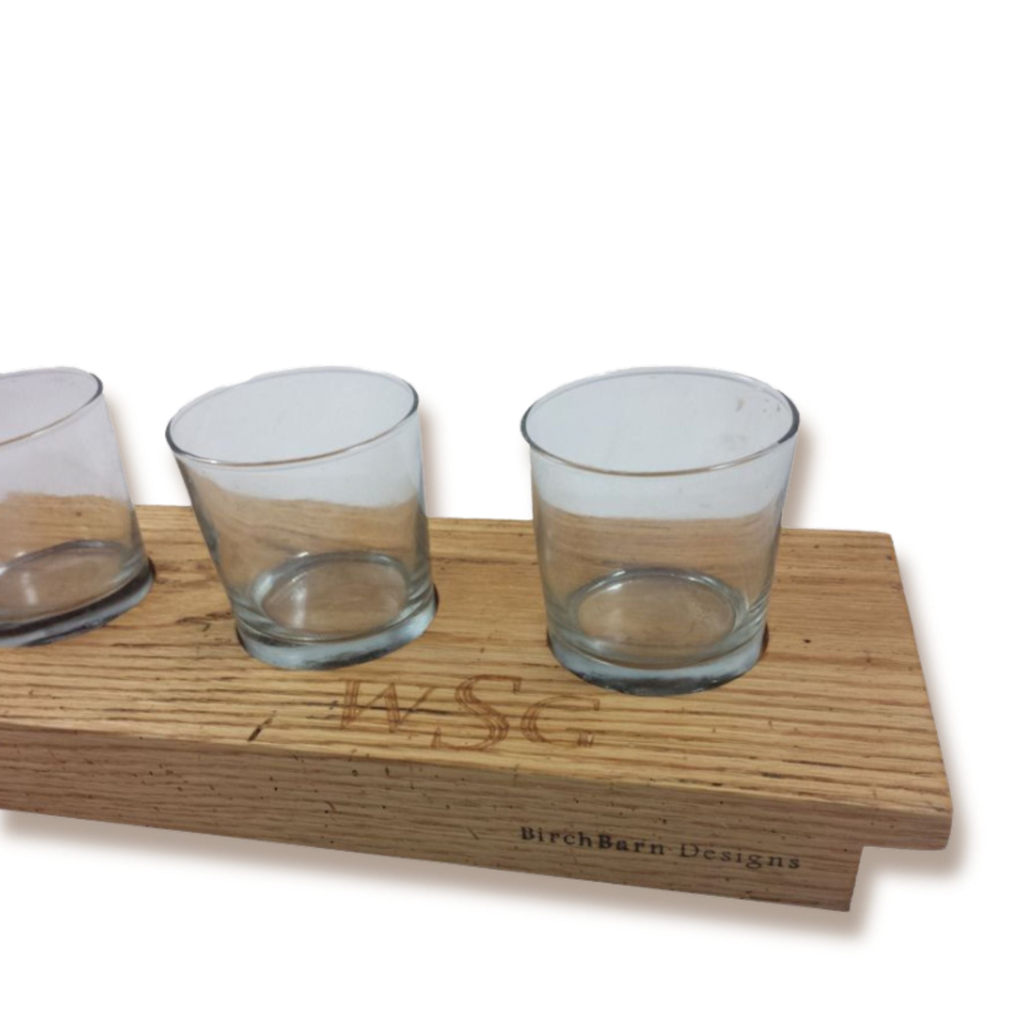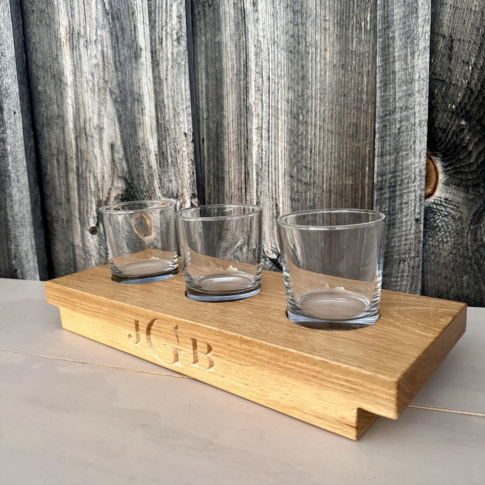 The perfect gift for all whiskey connoisseurs, these customizable oak flights are the ideal way to sample different spirits. Enjoy your favorites accompanied by the rustic and distinct broad-grain of the White Oak. The flight set includes three lowball glasses, as pictured, and makes a wonderfully unique gift.
