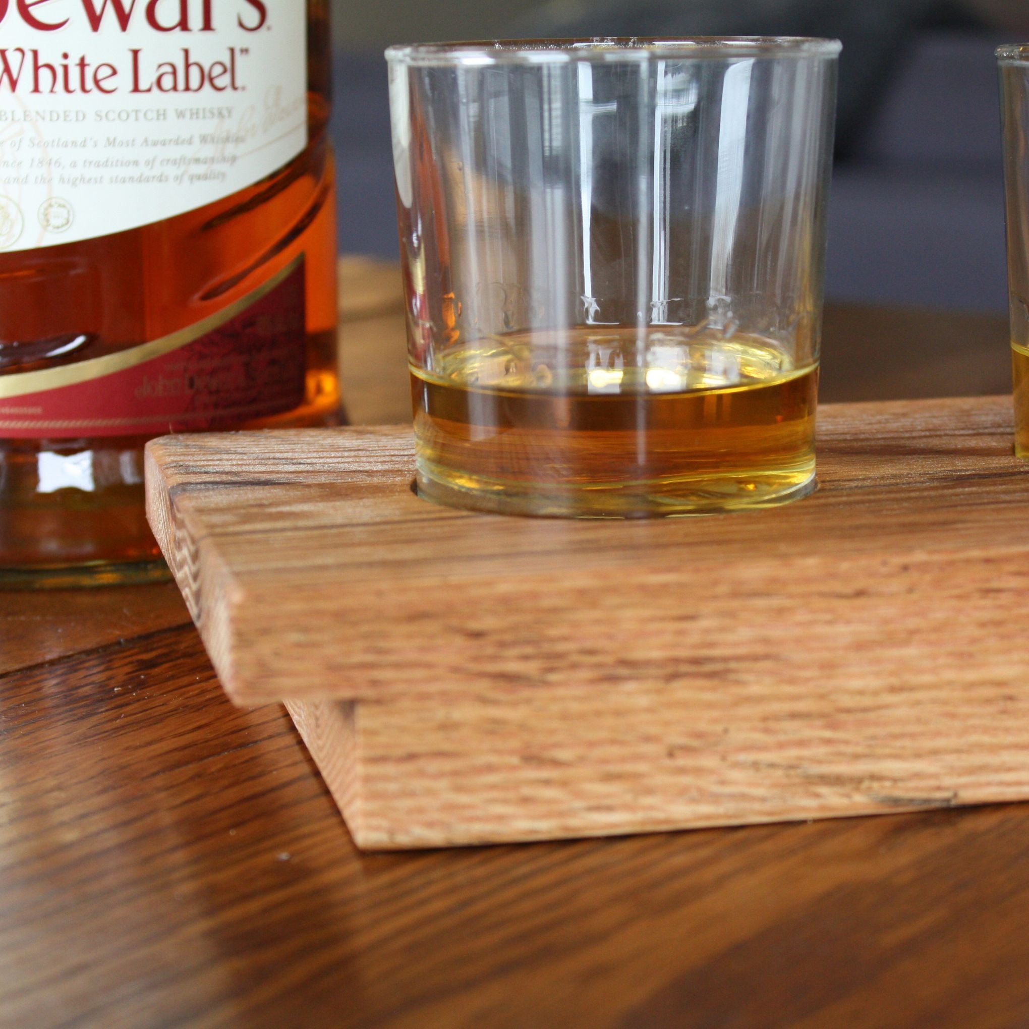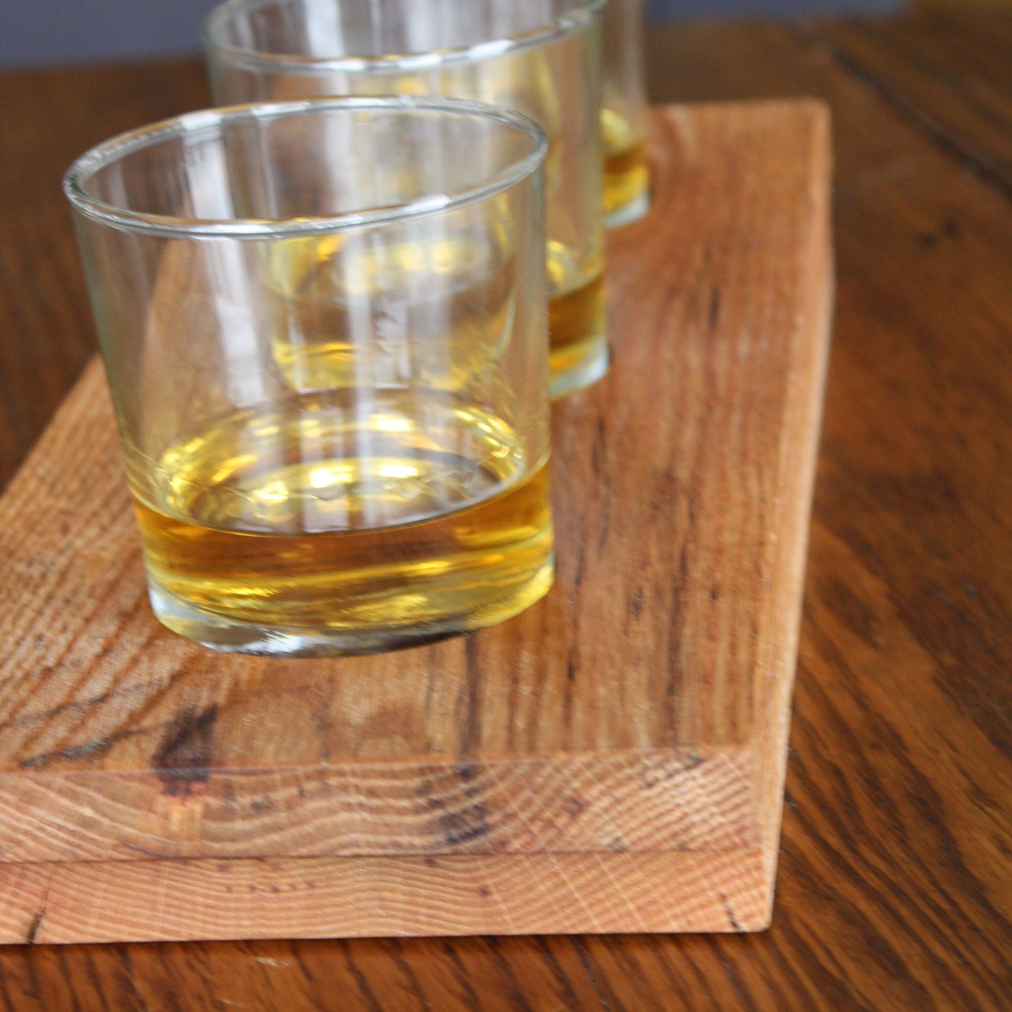 The tasting board also includes deeper cross-cut handles that keep to the natural, oaky look and makes transporting your fancy spirits a breeze! As with all our boards, each piece of wood lends its own markings and unique characteristics, making each finished Scotch Whiskey Flight truly one of a kind.
