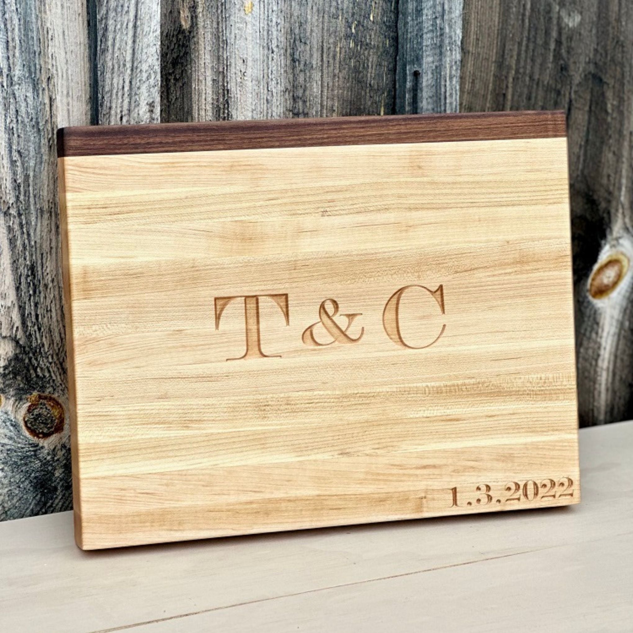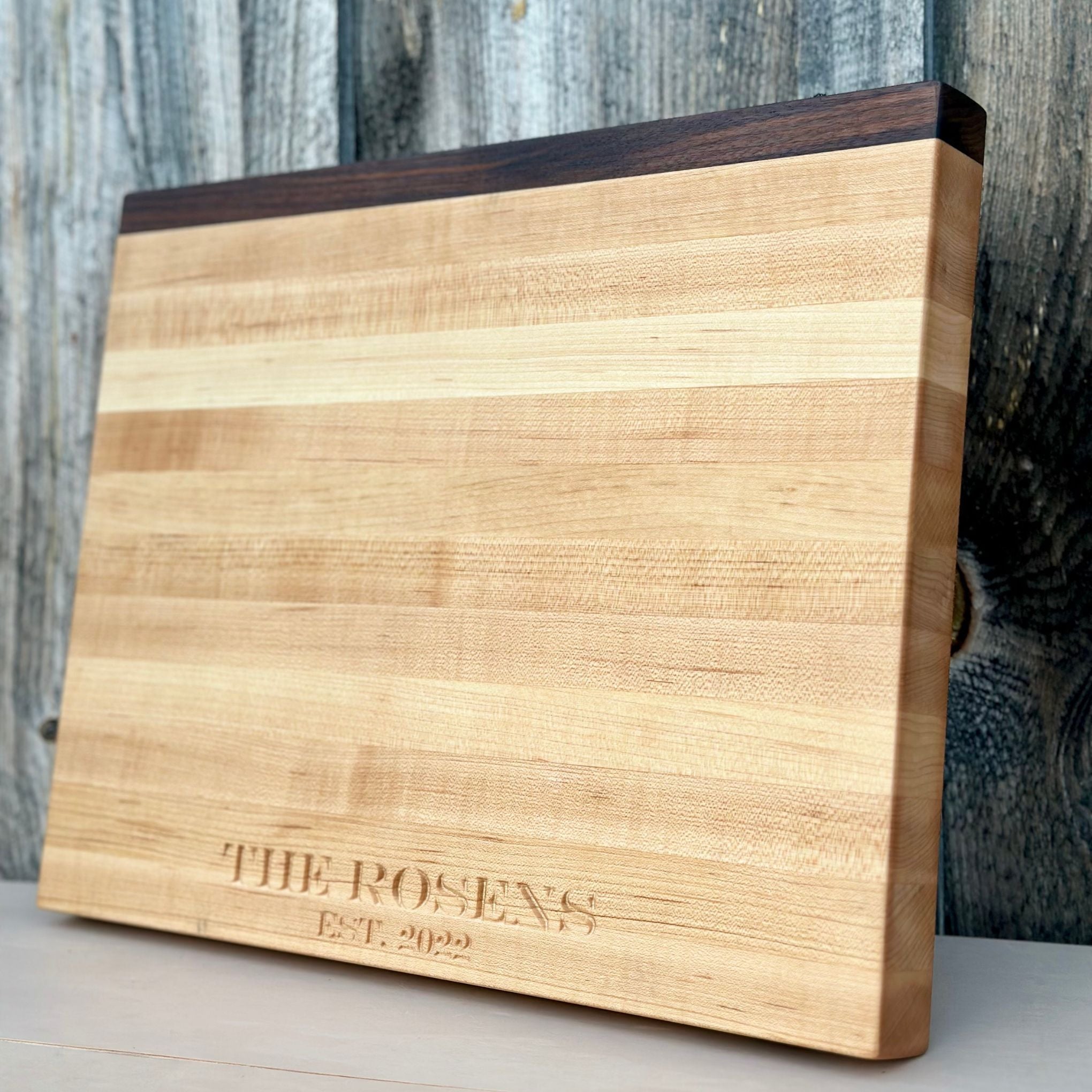 You can add a juice groove to one side of your Signature Essentials-Edge Grain, walnut and maple, cutting board to catch anything from meat juice to garlic peels. The light maple canvas is a perfect backdrop for a name, date, or even your custom logo.