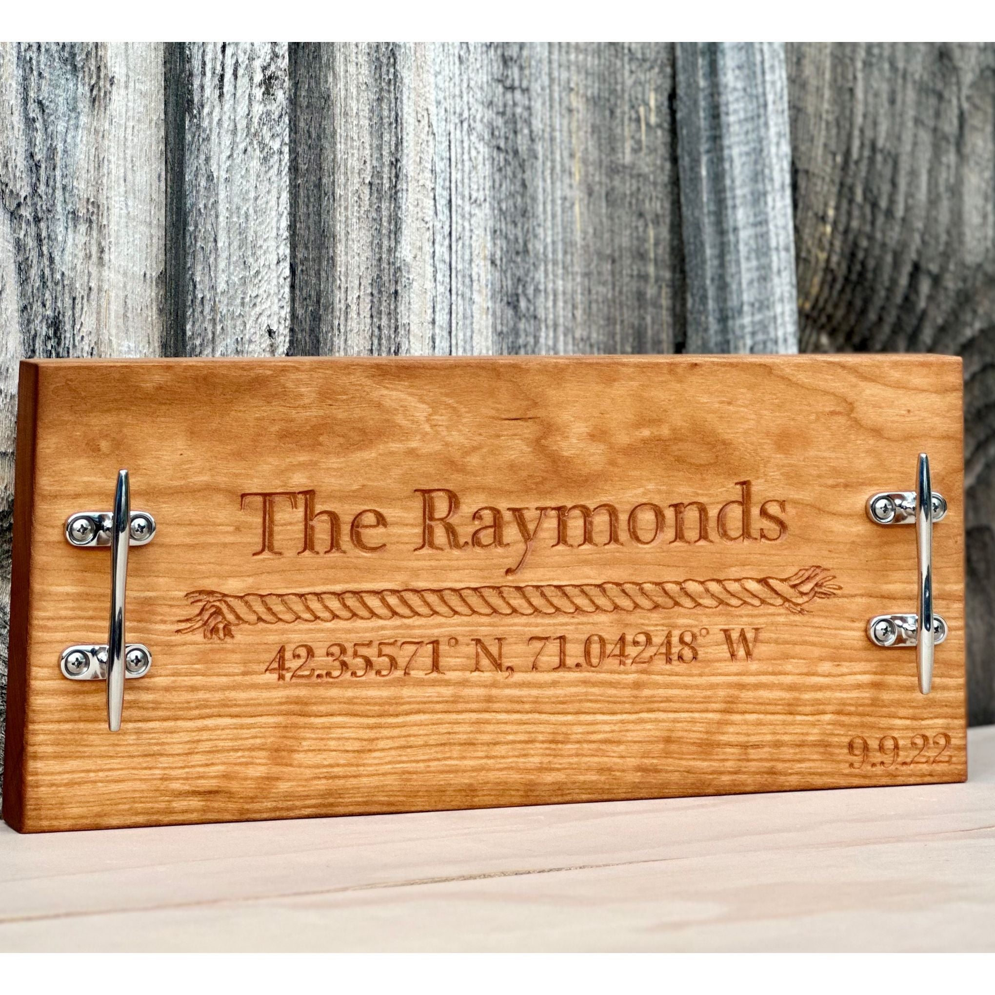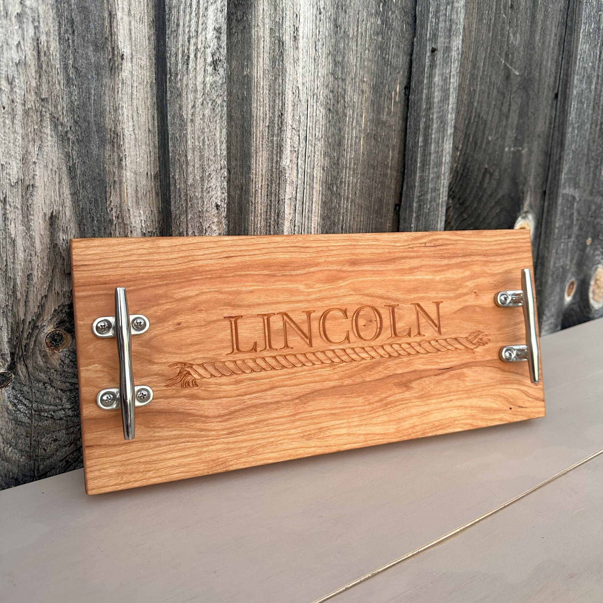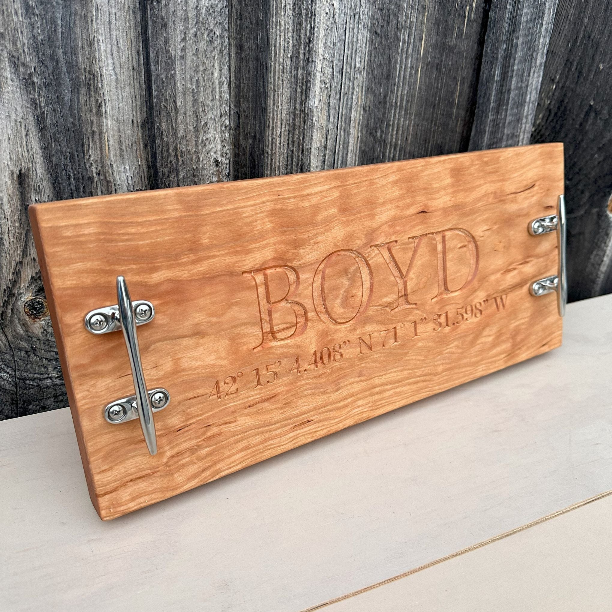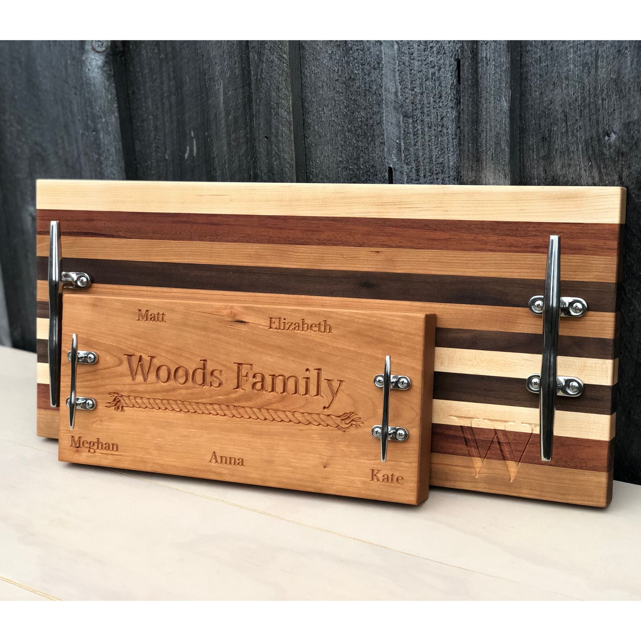 The classic cherry charcuterie board has wood grain patterns that pair well with any decor. While they may have other uses, the 4″ stainless steel nautical cleats make perfect handles for carrying your charcuterie spread.