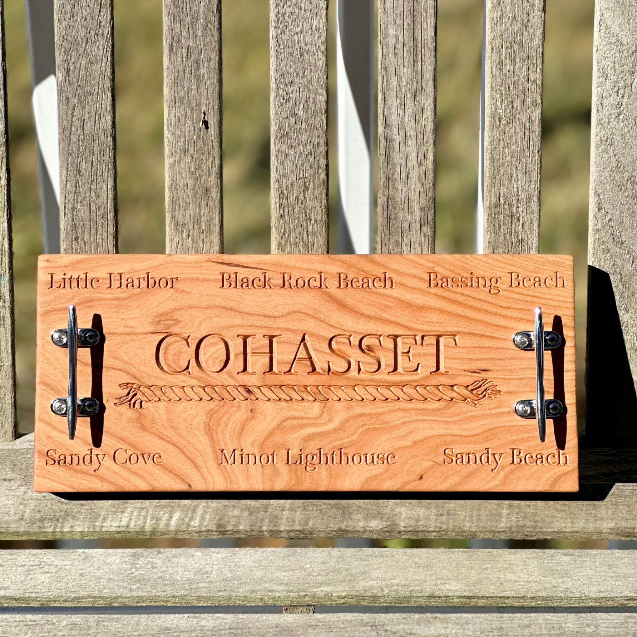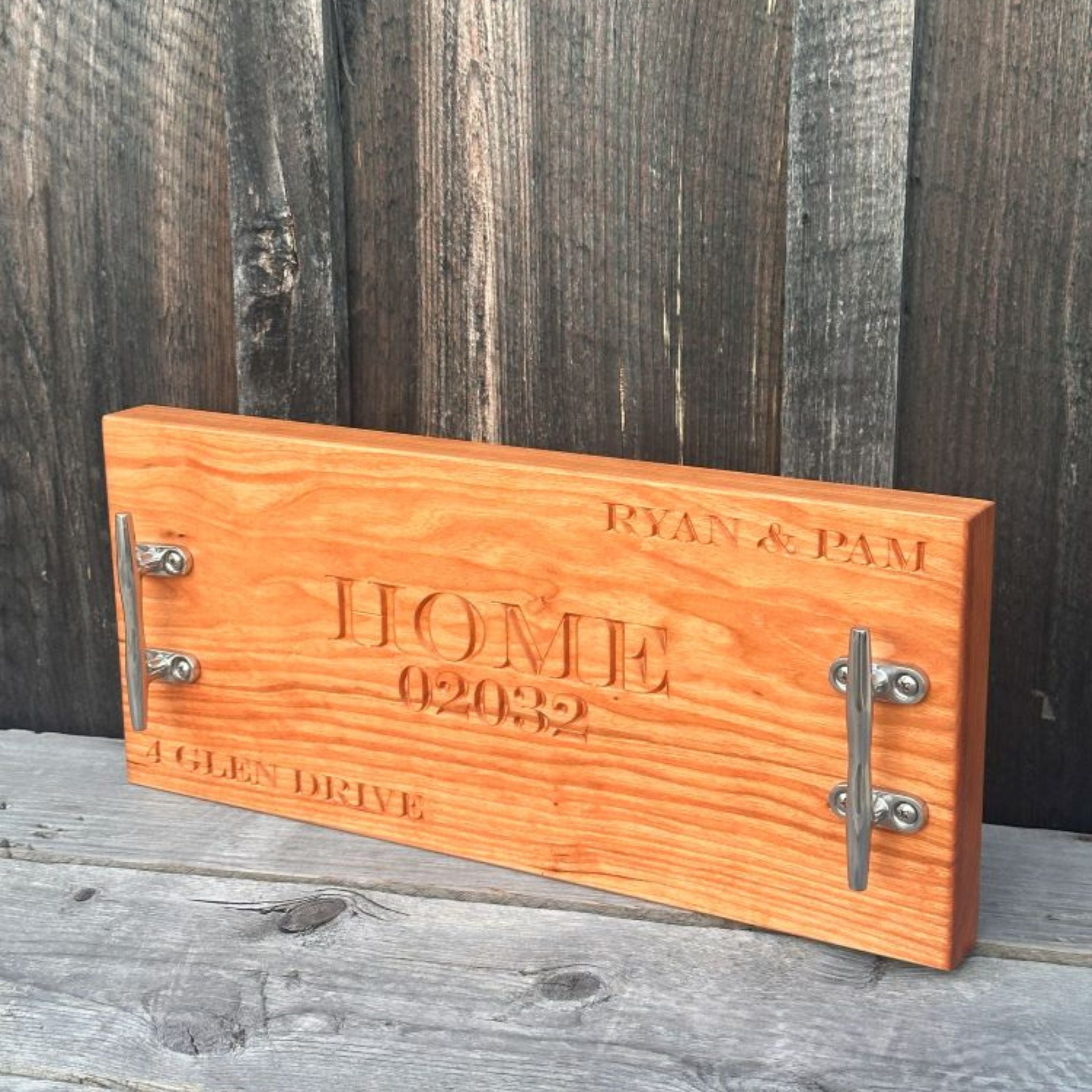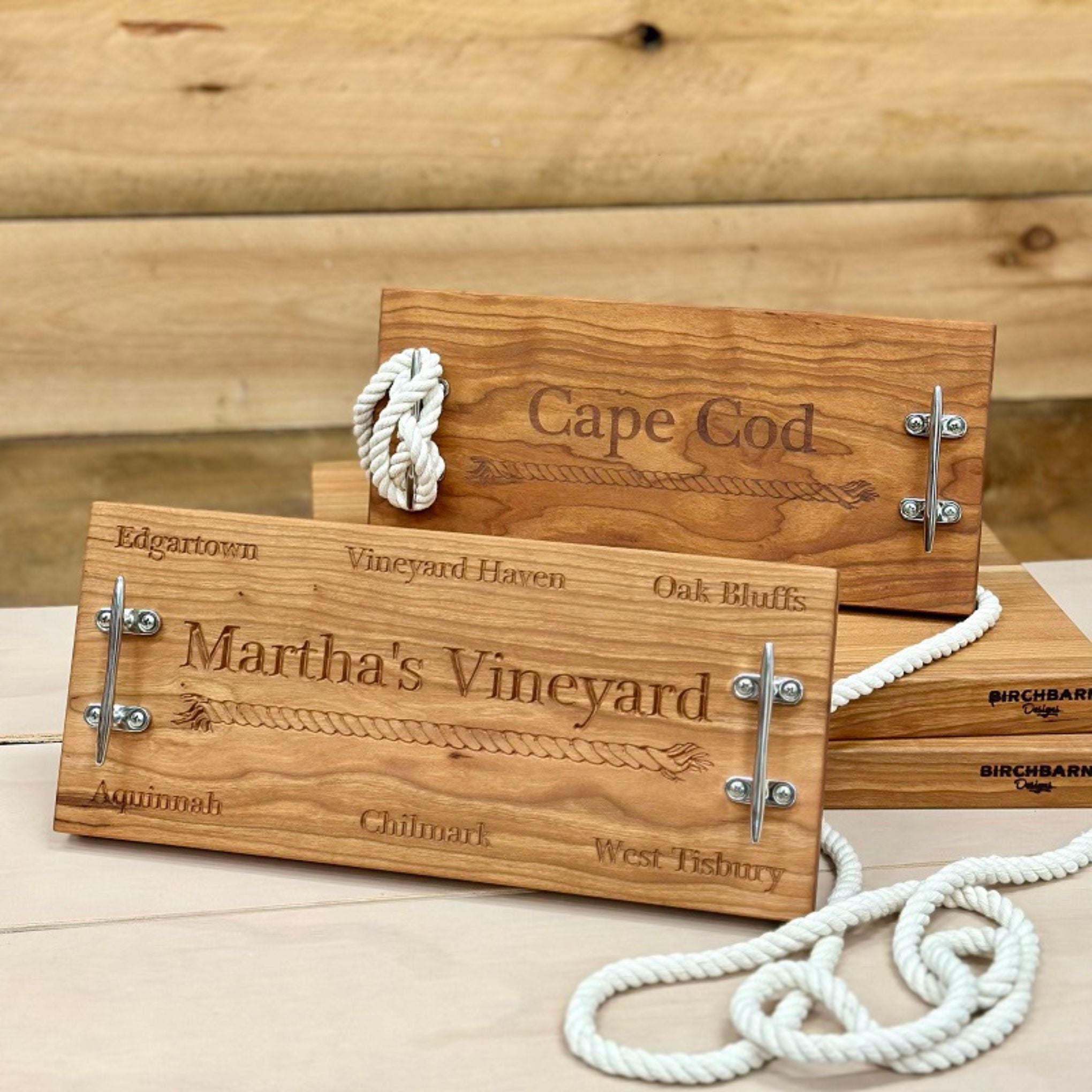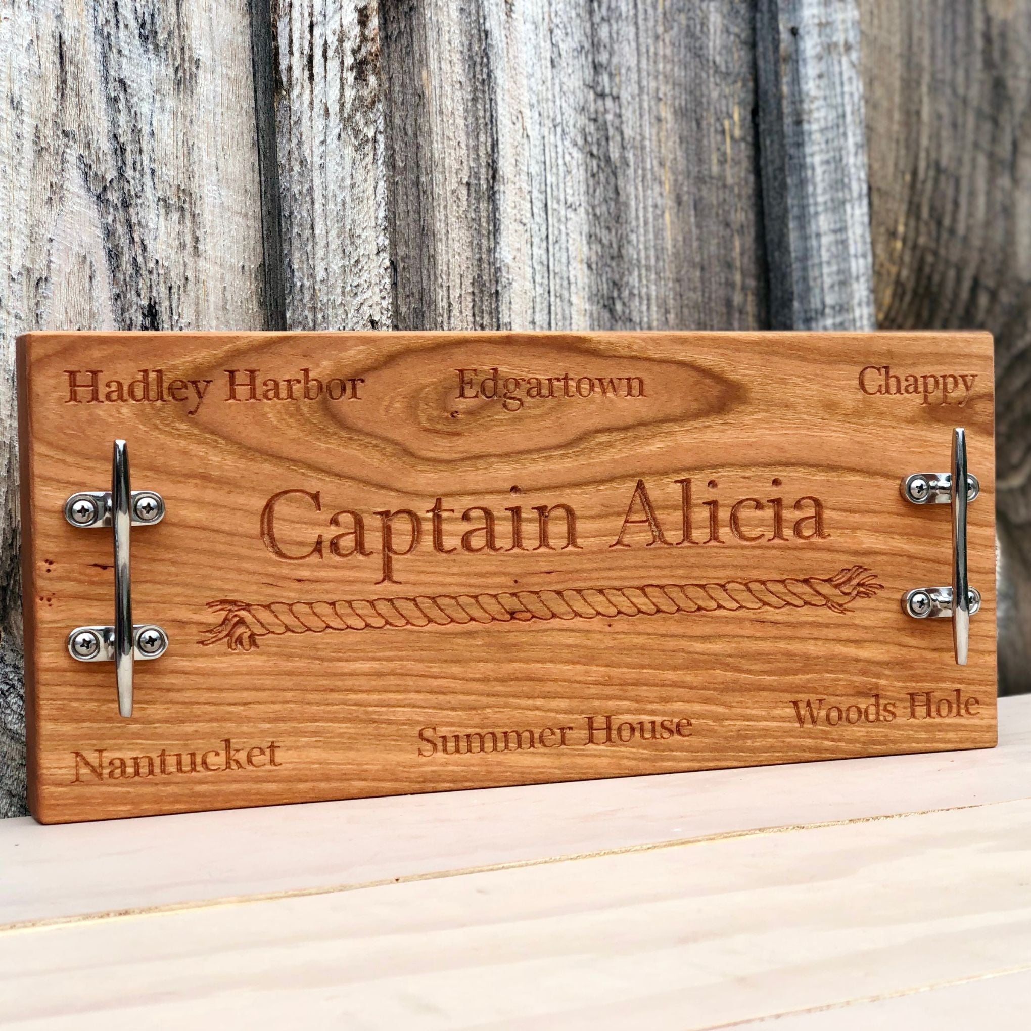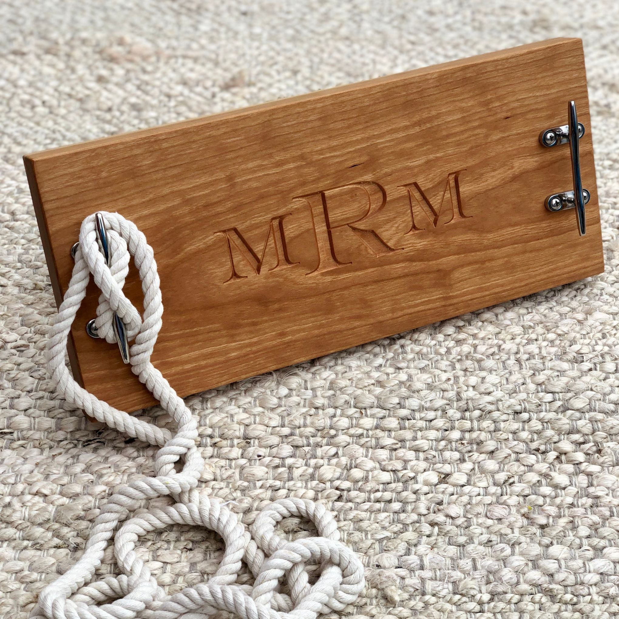 The classic cherry charcuterie board has wood grain patterns that pair well with any decor. While they may have other uses, the 4″ stainless steel nautical cleats make perfect handles for carrying your charcuterie spread.
