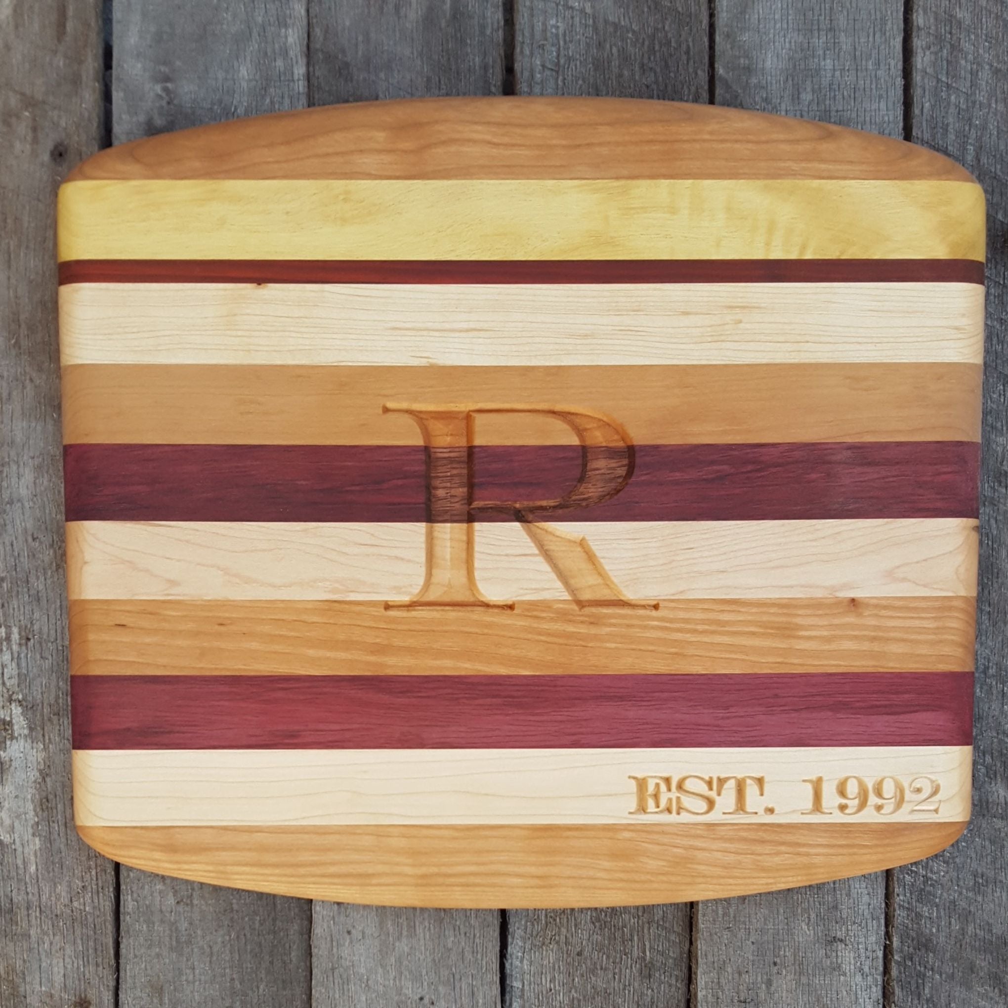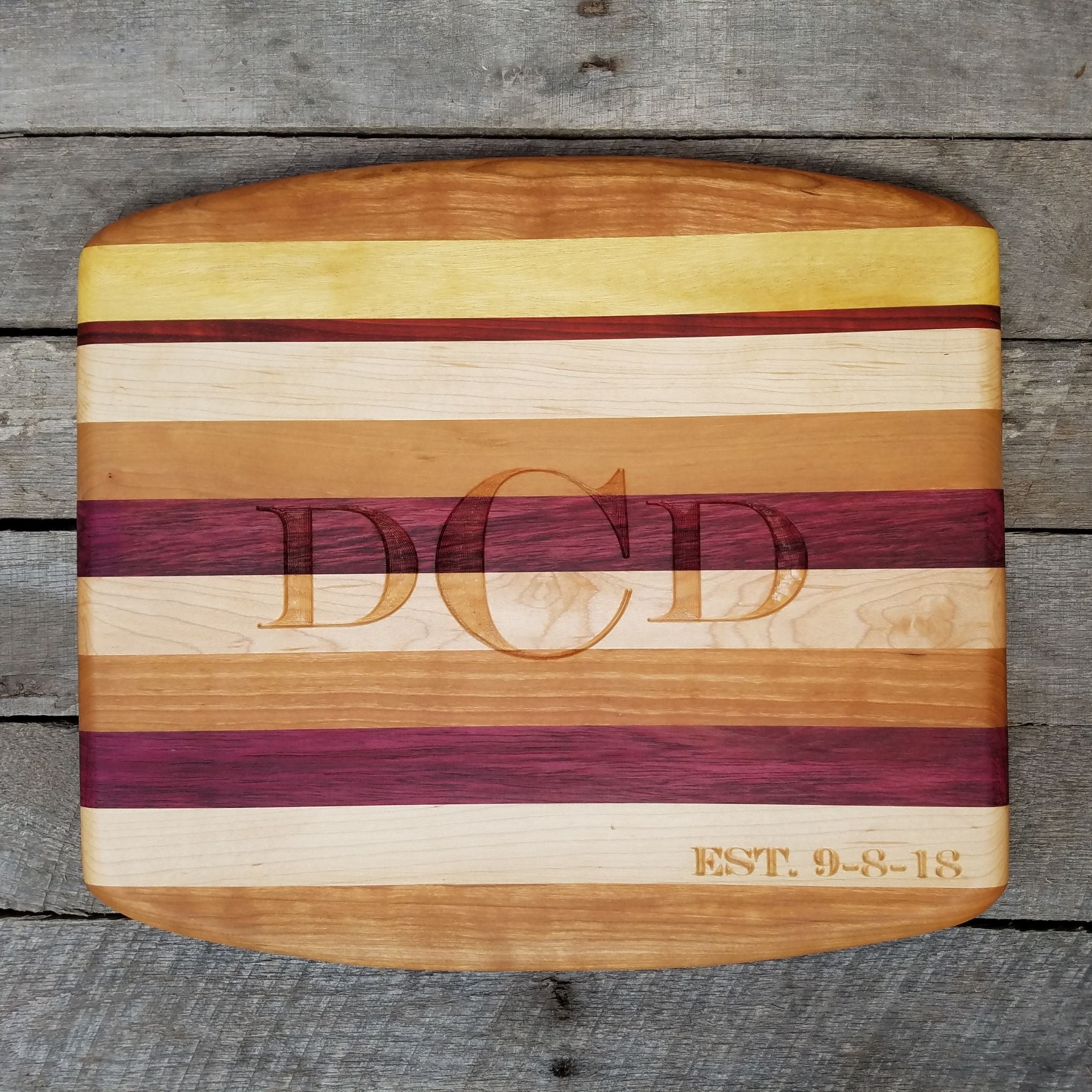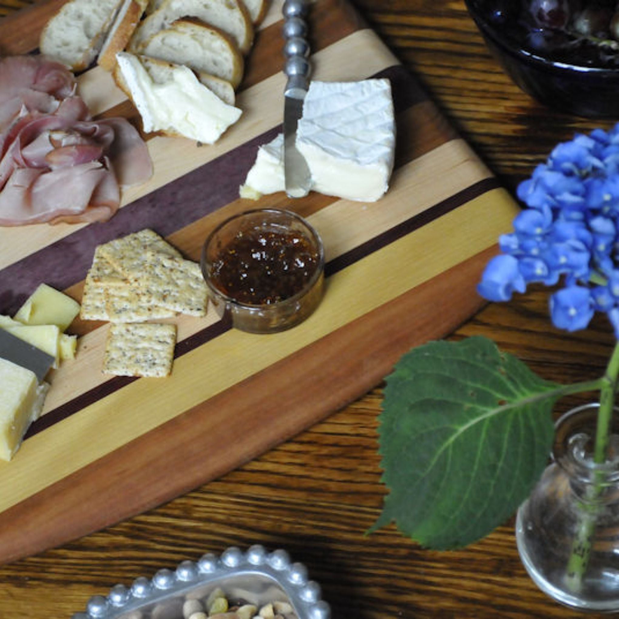 The Spring Fling, the eye-catching charcuterie board, uses a few exotic hardwoods including Yellowheart, Purpleheart, and African Padauk. To keep these neon-looking materials looking lively, be sure to occasionally treat the board with food-safe mineral oil, which will nourish the wood and enhance its natural sheen.