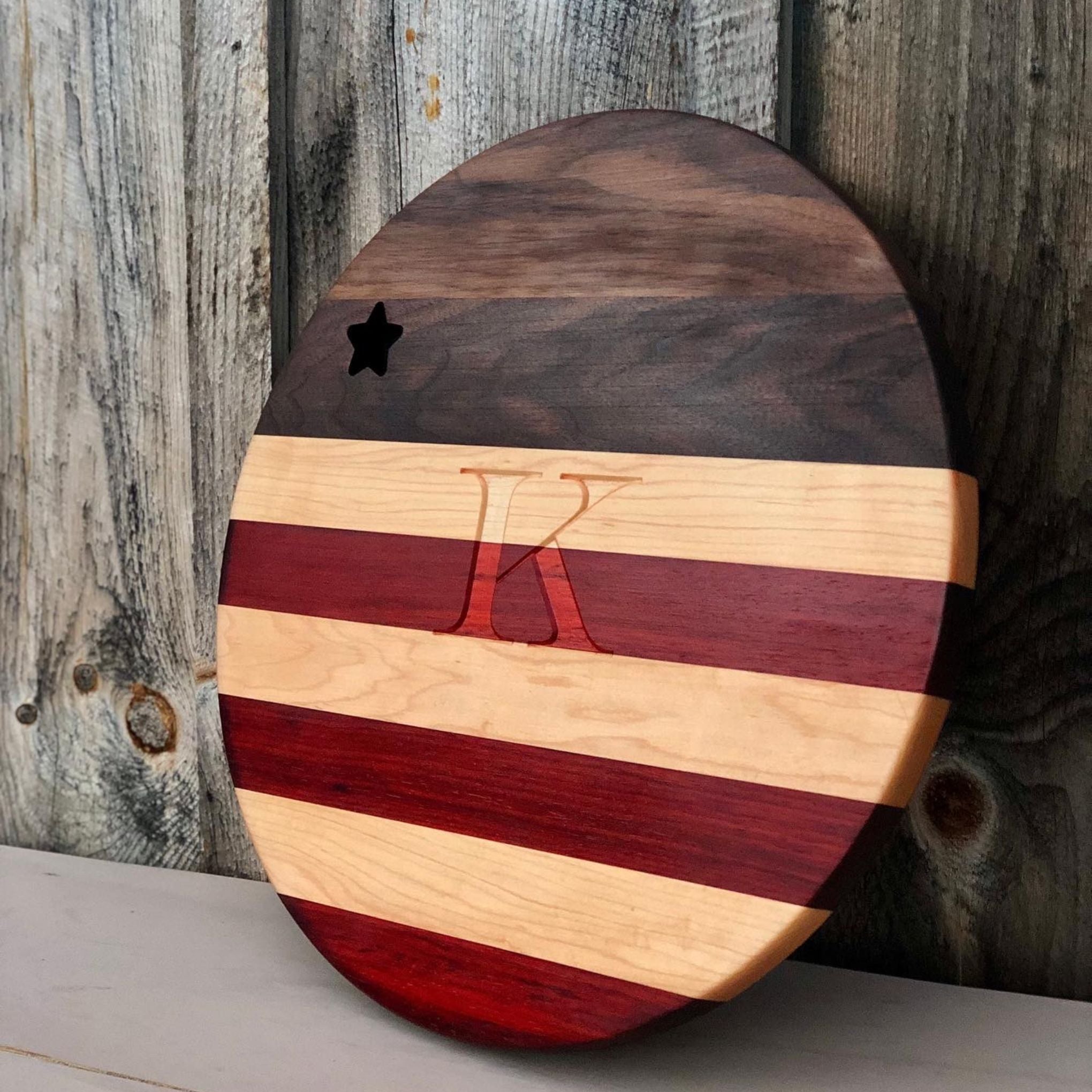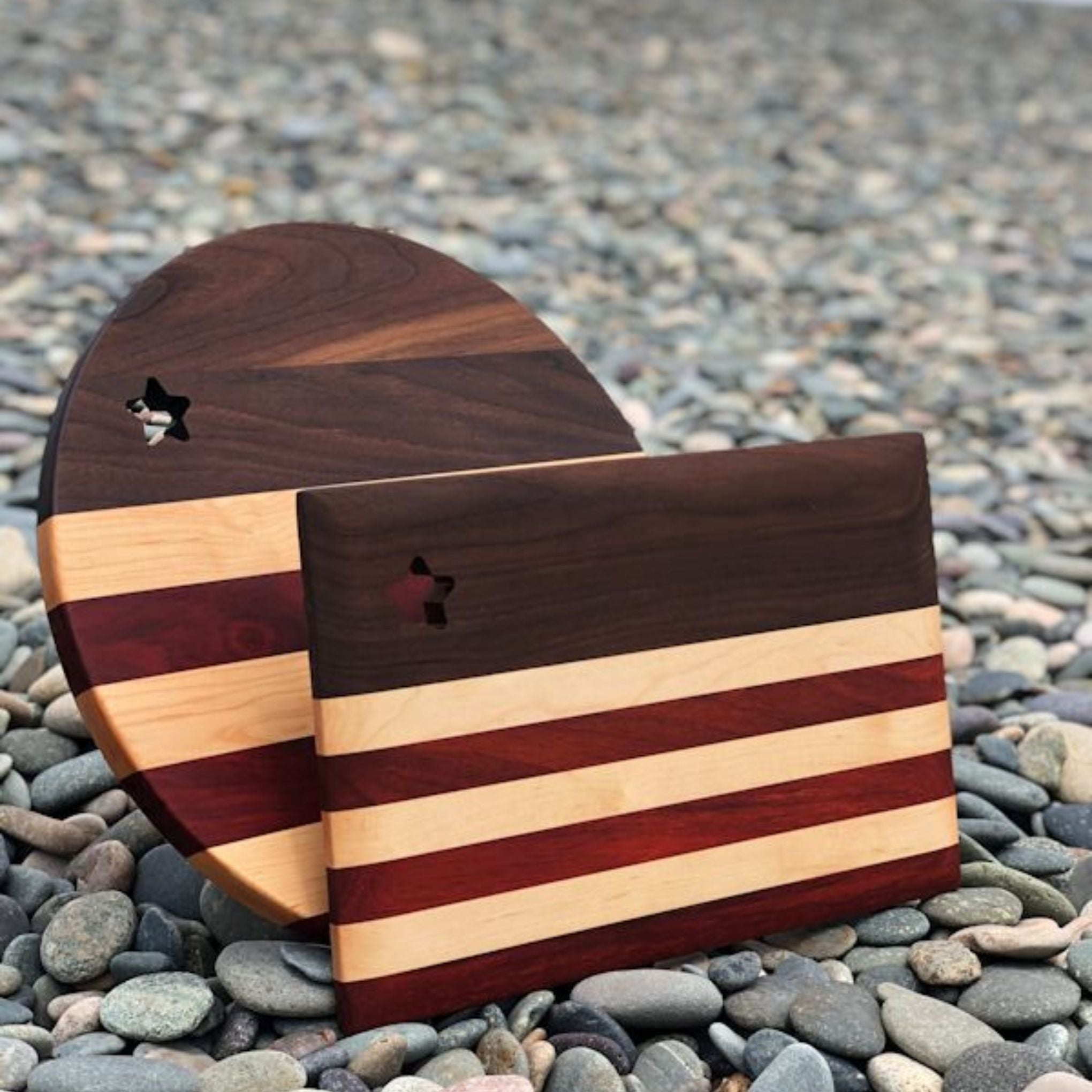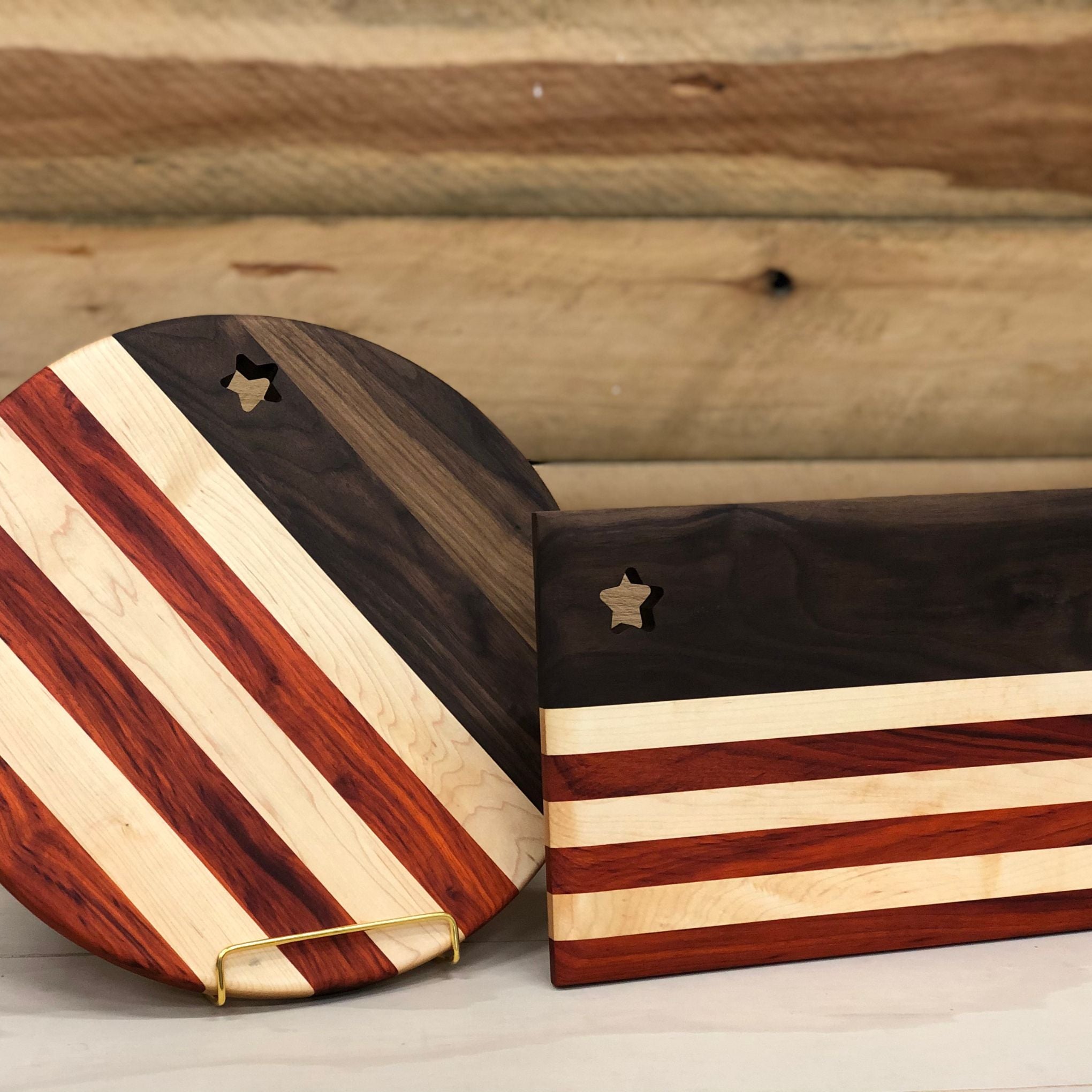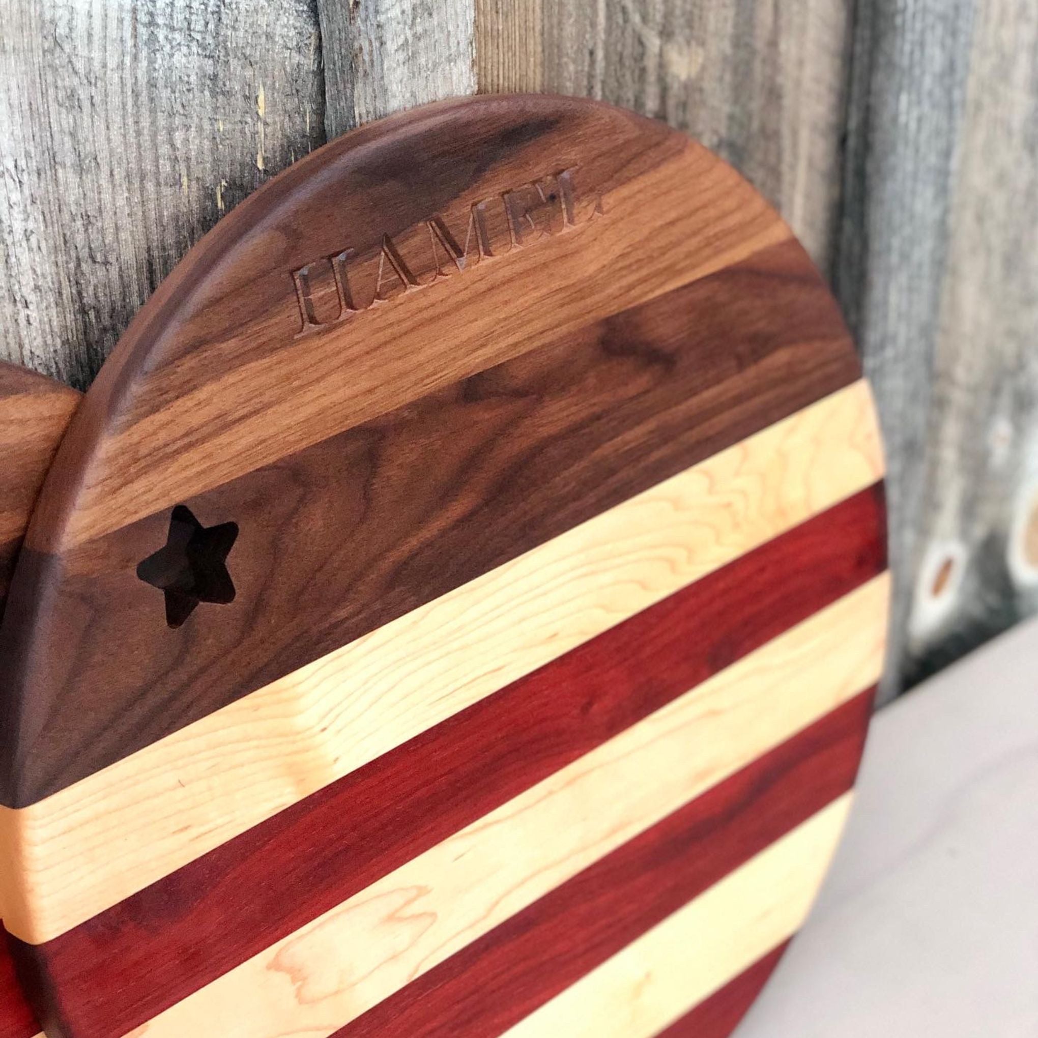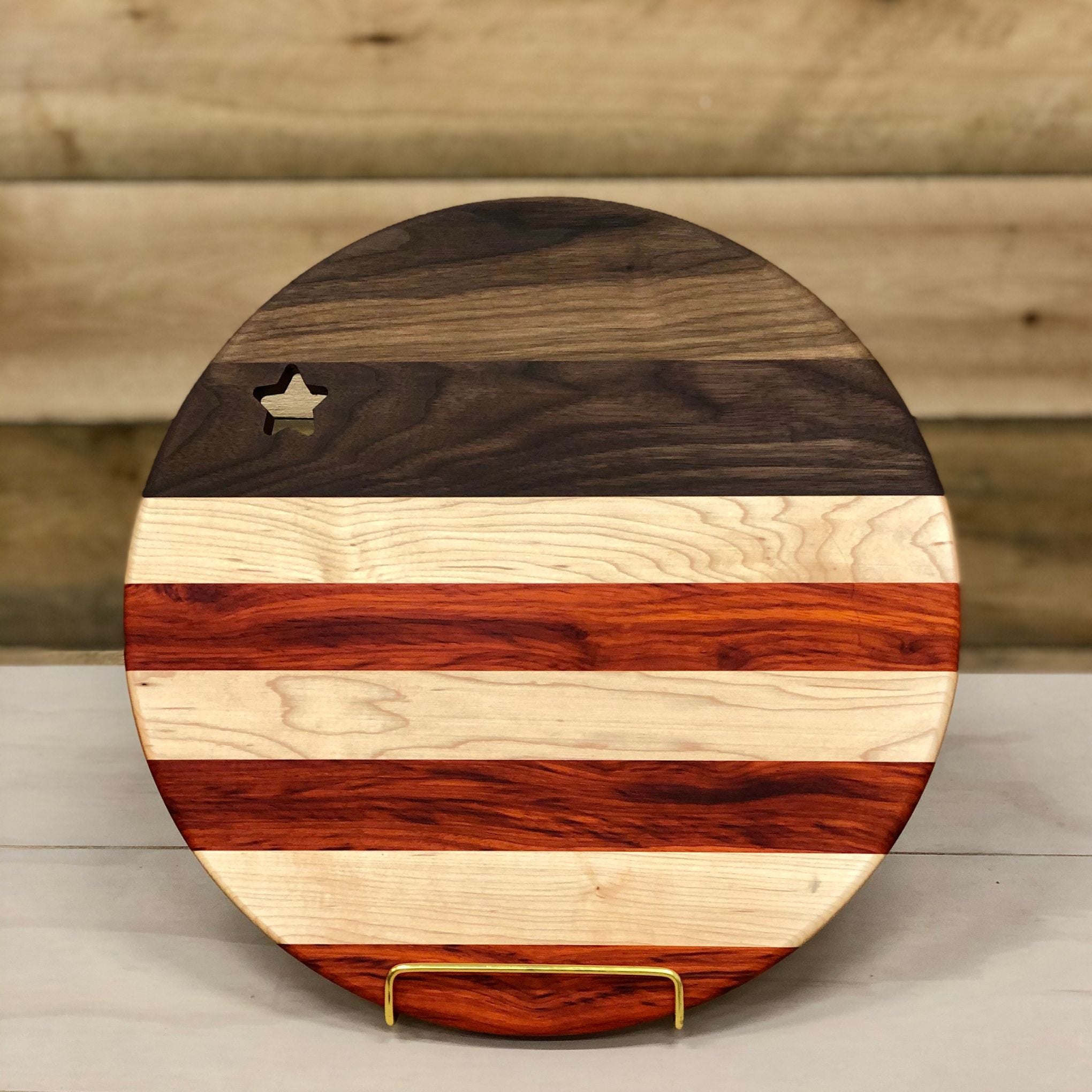 The Star-Spangled Server measures 16″ in diameter and showcases rich walnut wood at the top and alternating strips of maple and padauk on the bottom to represent the stripes of the American Flag. The flag cutting board features a star cutout which is both a decorative accent and a place to hang and proudly display the board when not in use.