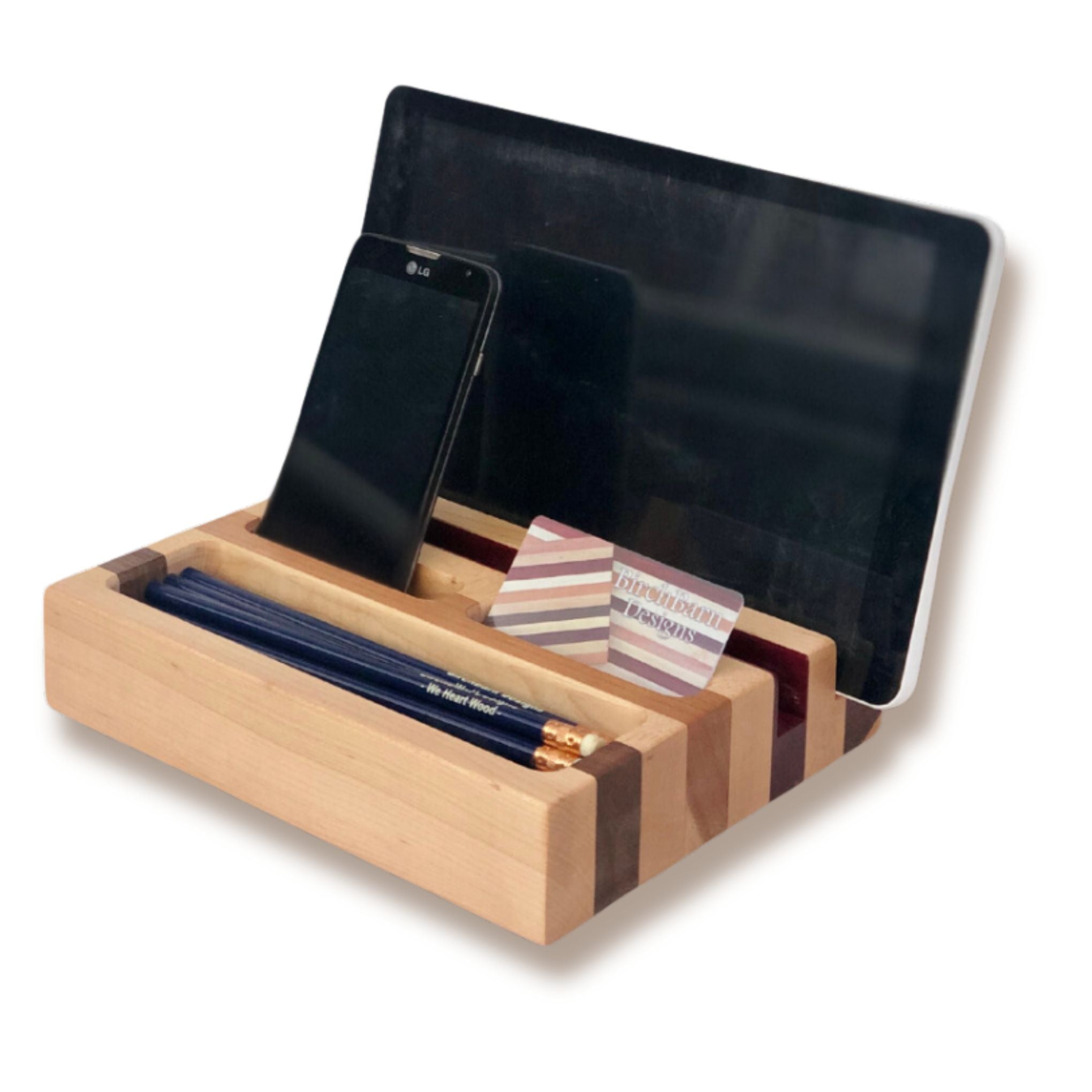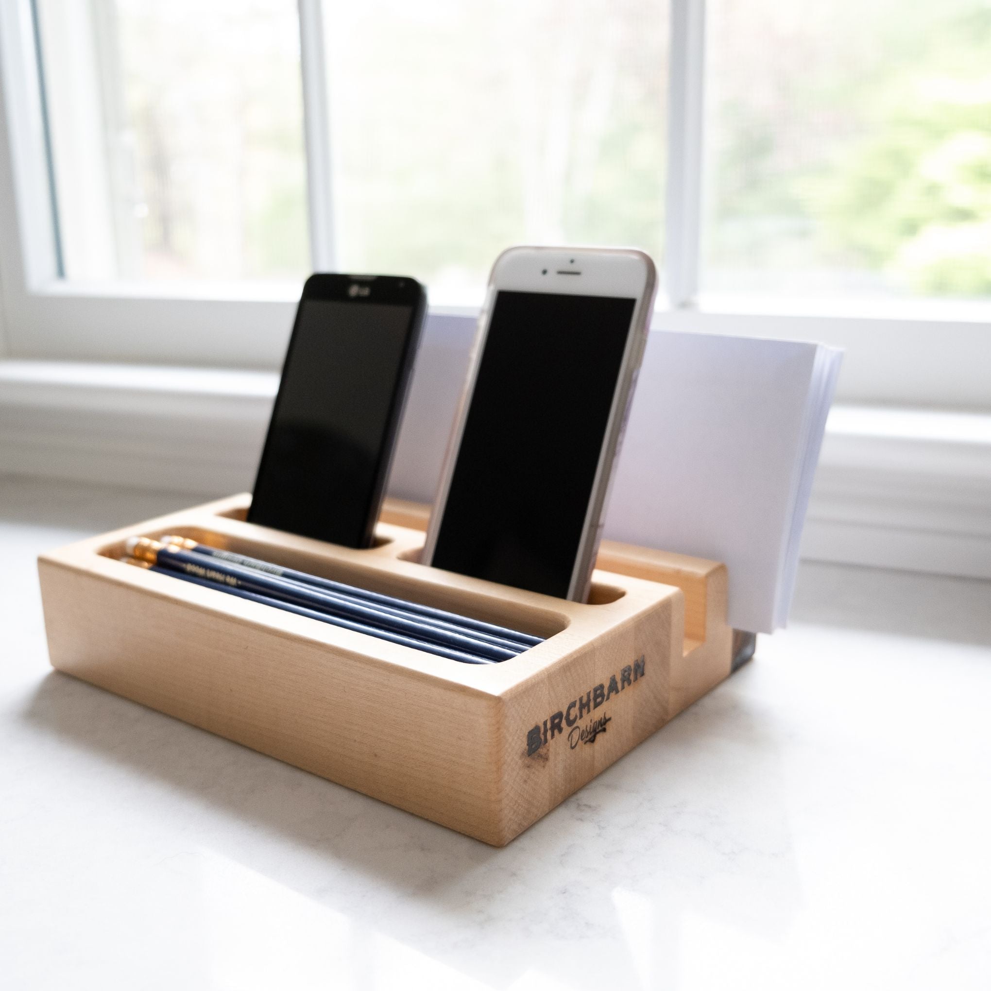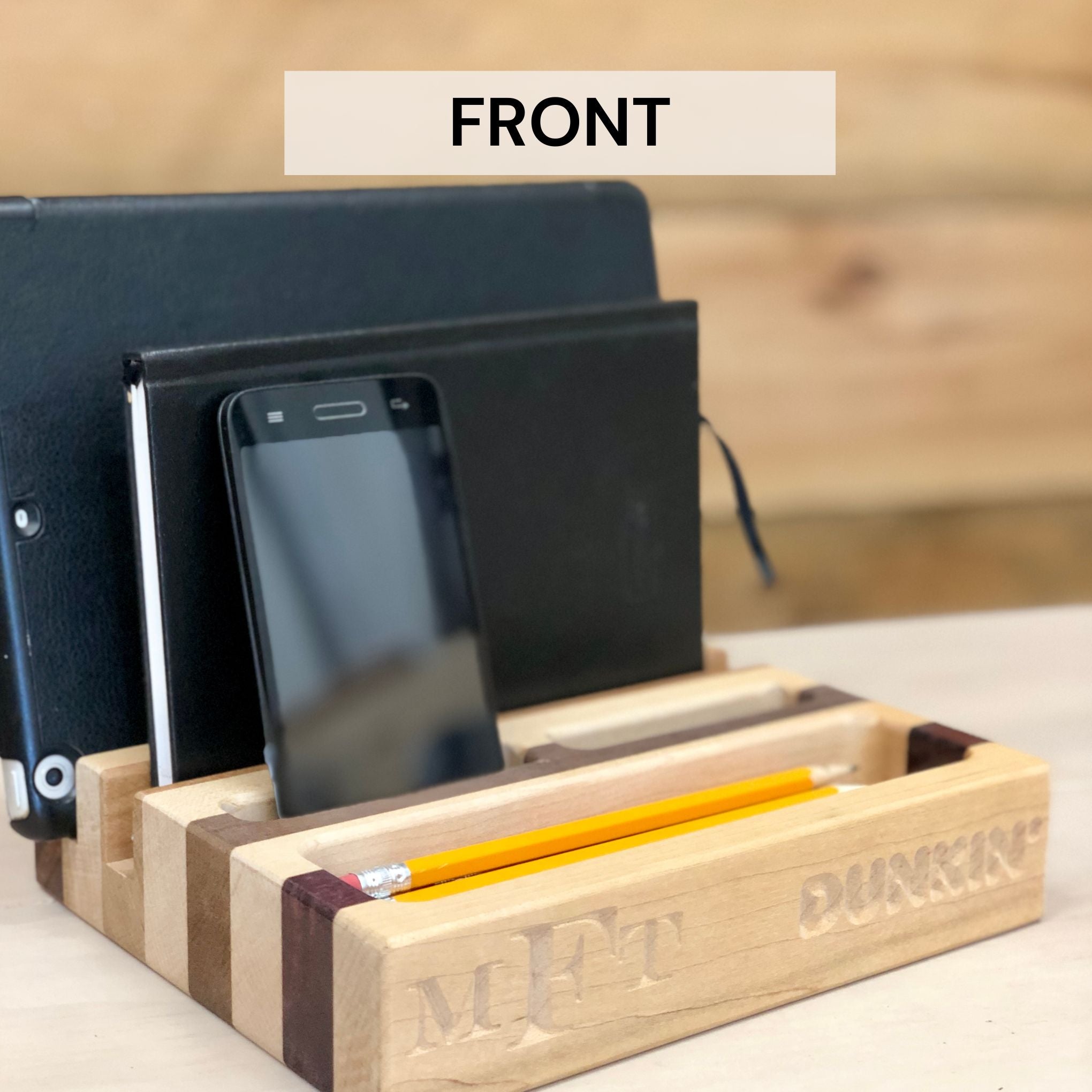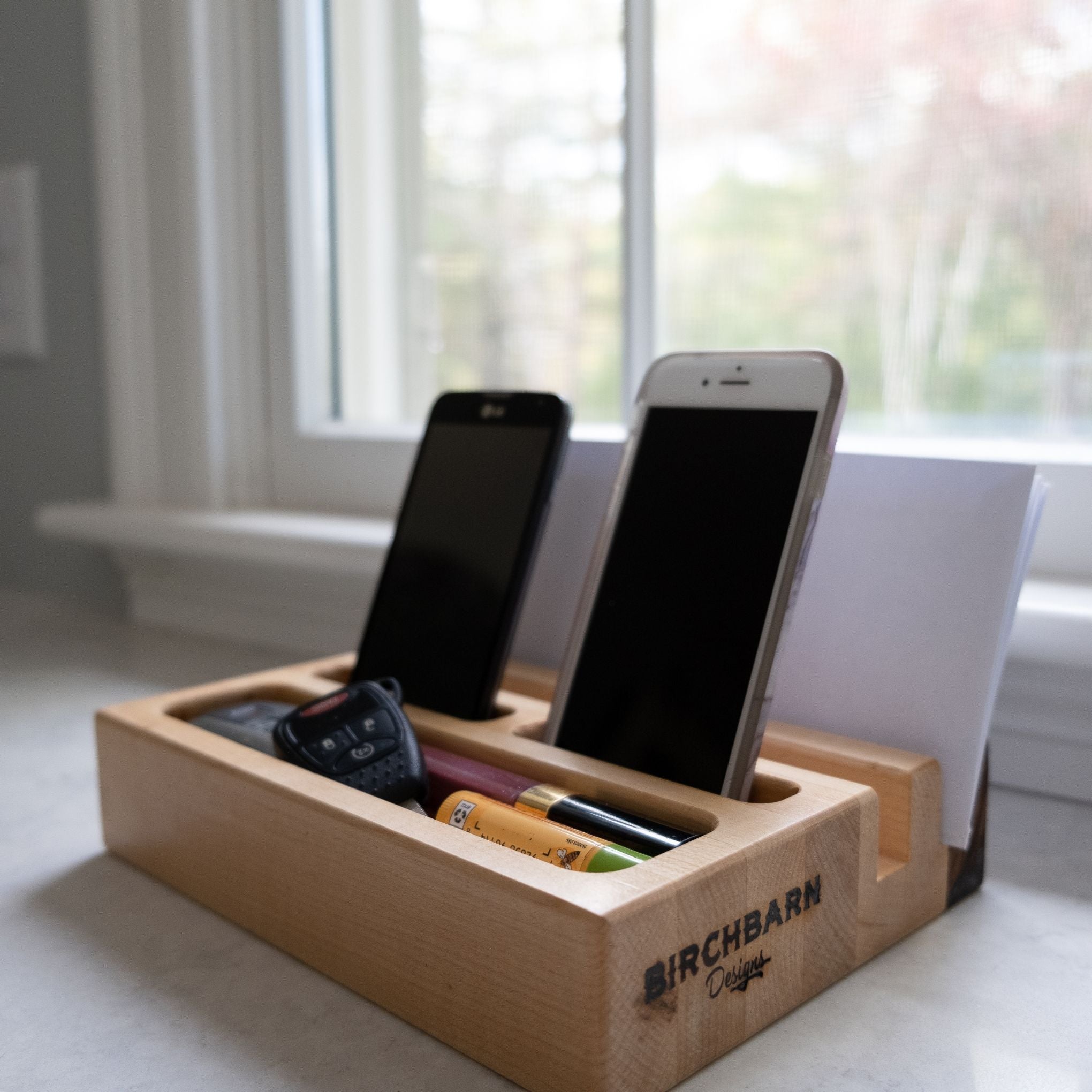 The wooden docking station is handcrafted from assorted hardwoods. The Stage provides a stylish and organized solution for all your electronic and paper essentials.
