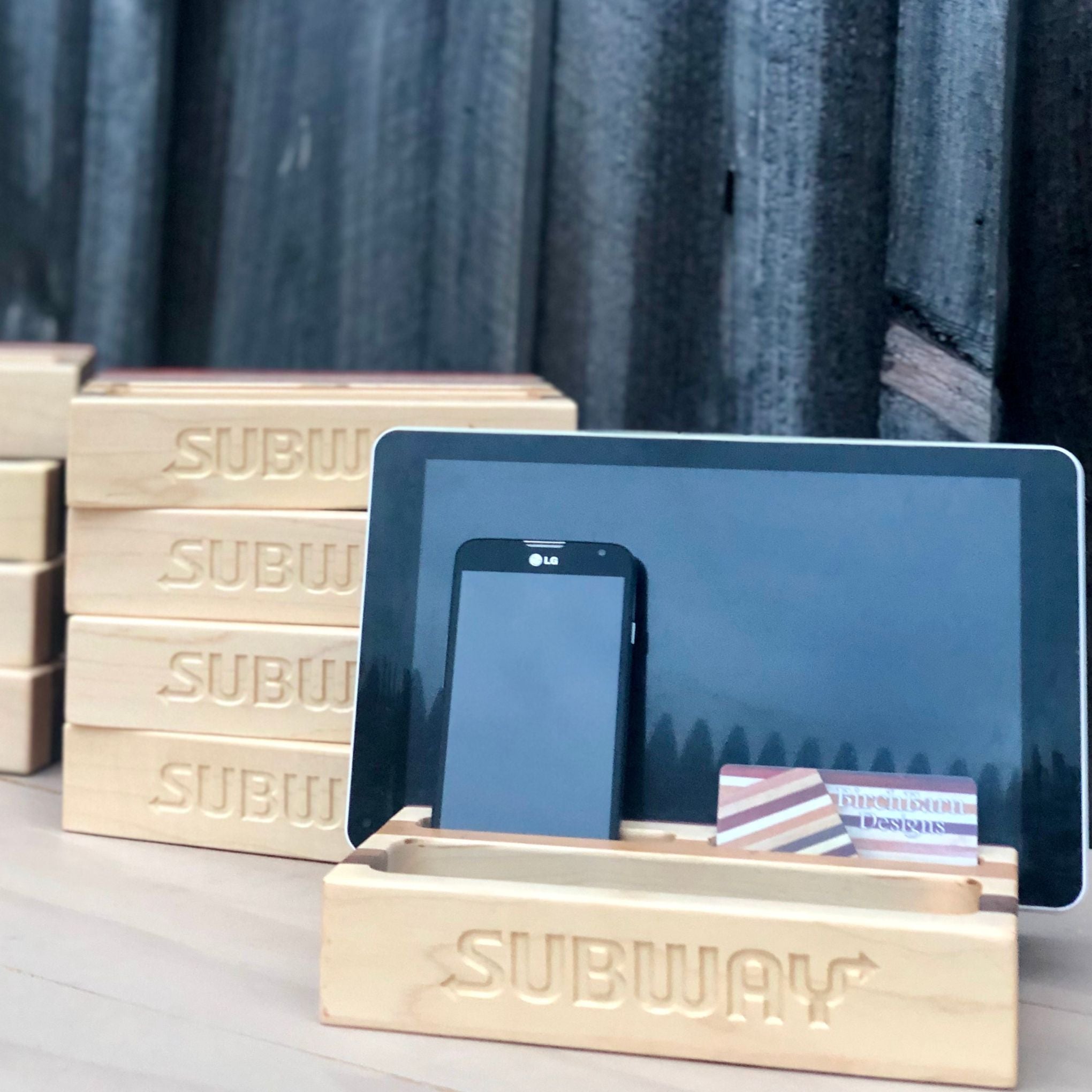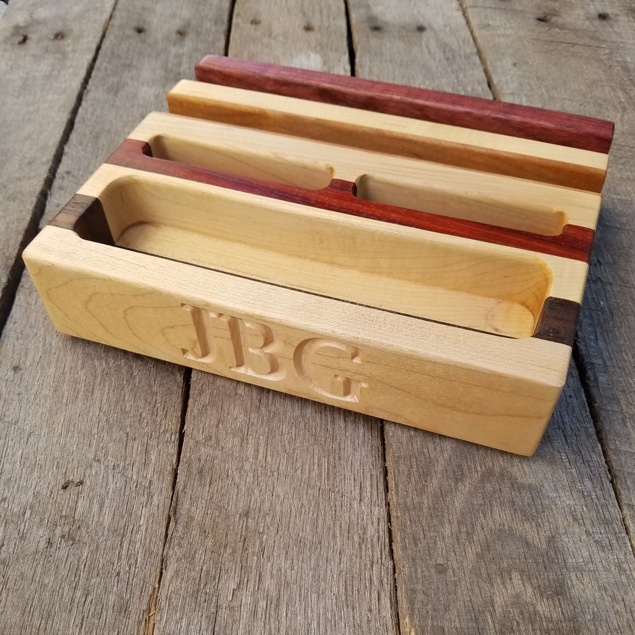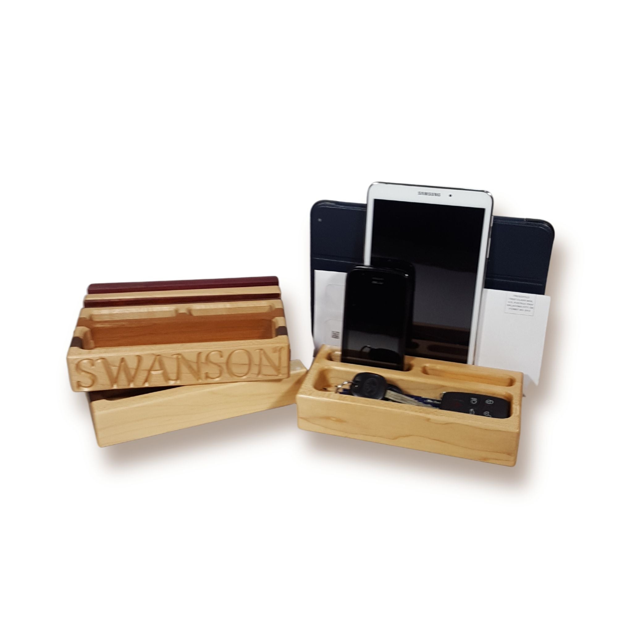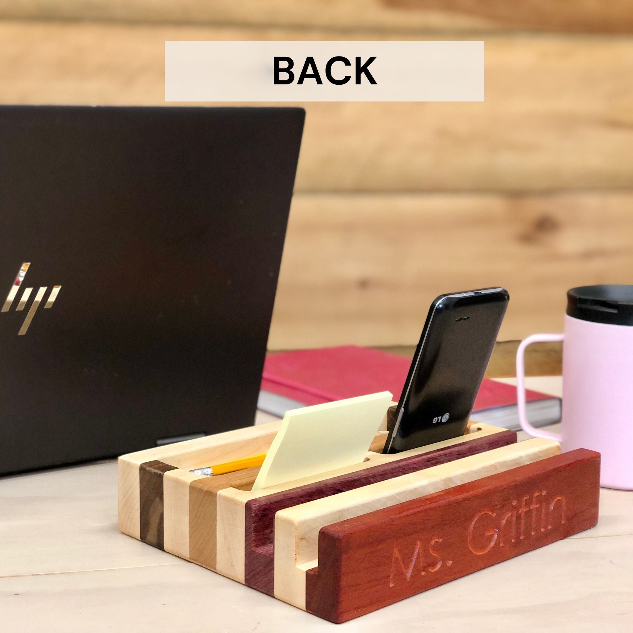 The wooden docking station is handcrafted from assorted hardwoods. The Stage provides a stylish and organized solution for all your electronic and paper essentials.