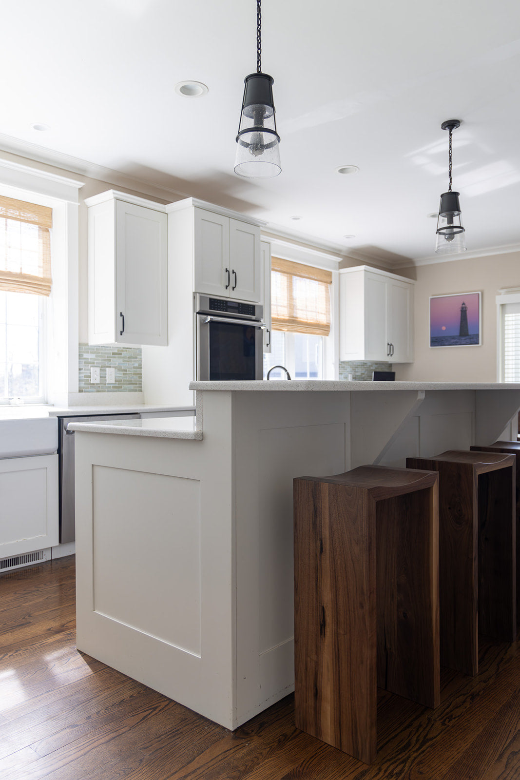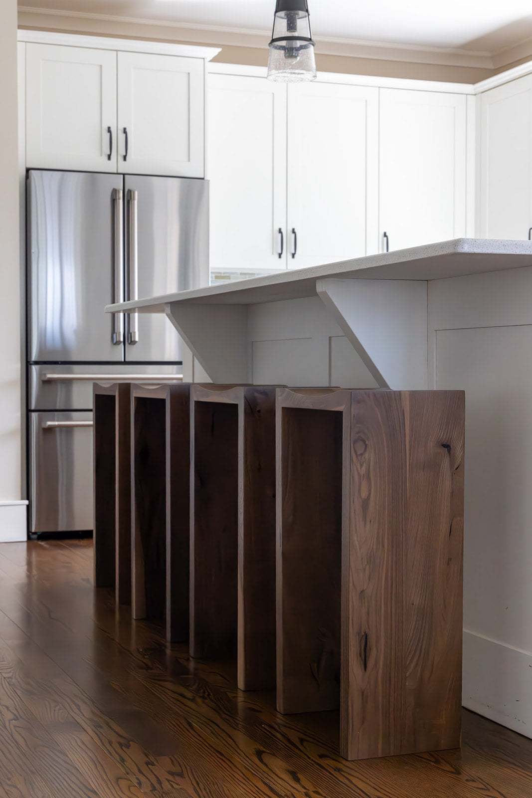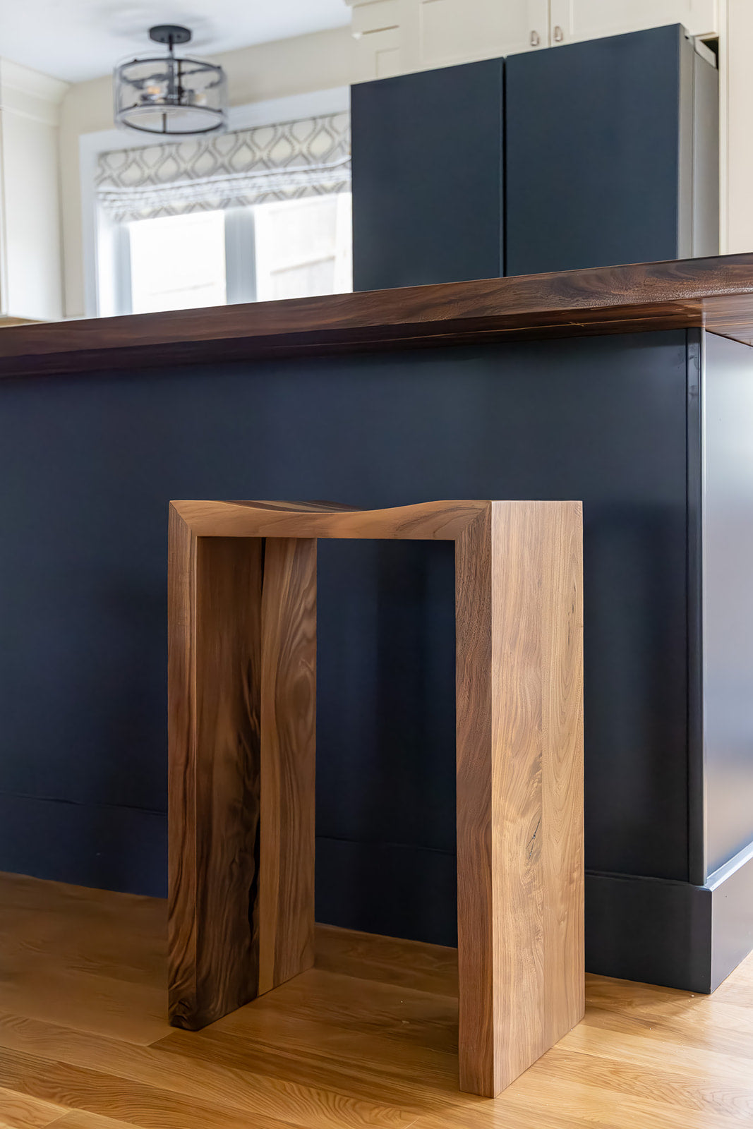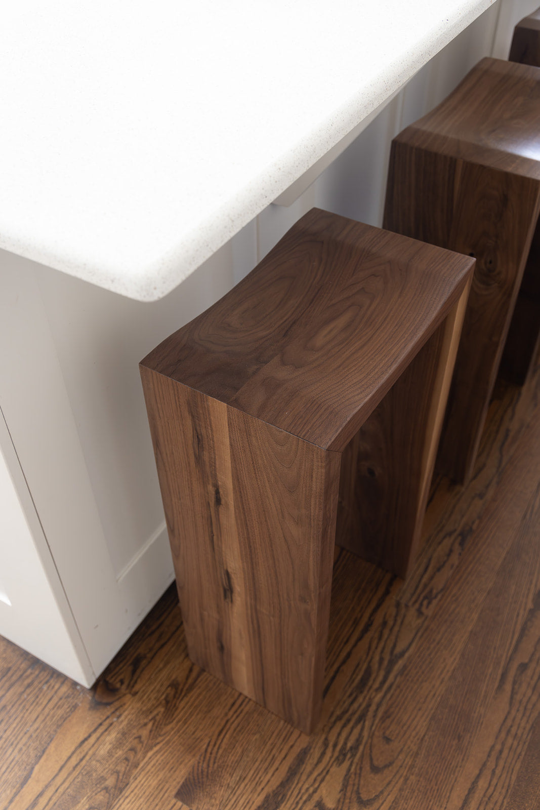 Sleek and modern design meets purpose and function, the Waterfall Stool will bring visual drama to your counter or bar space. Custom made and built by hand, the stools can be custom ordered and crafted in a variety of woods including black walnut, white oak, cherry or maple in your preferred height, including counter height, bar height, stool height, desk or even console table. The mitered edge provides for a seamless look that will elevate any space with a modern, intricately crafted design.