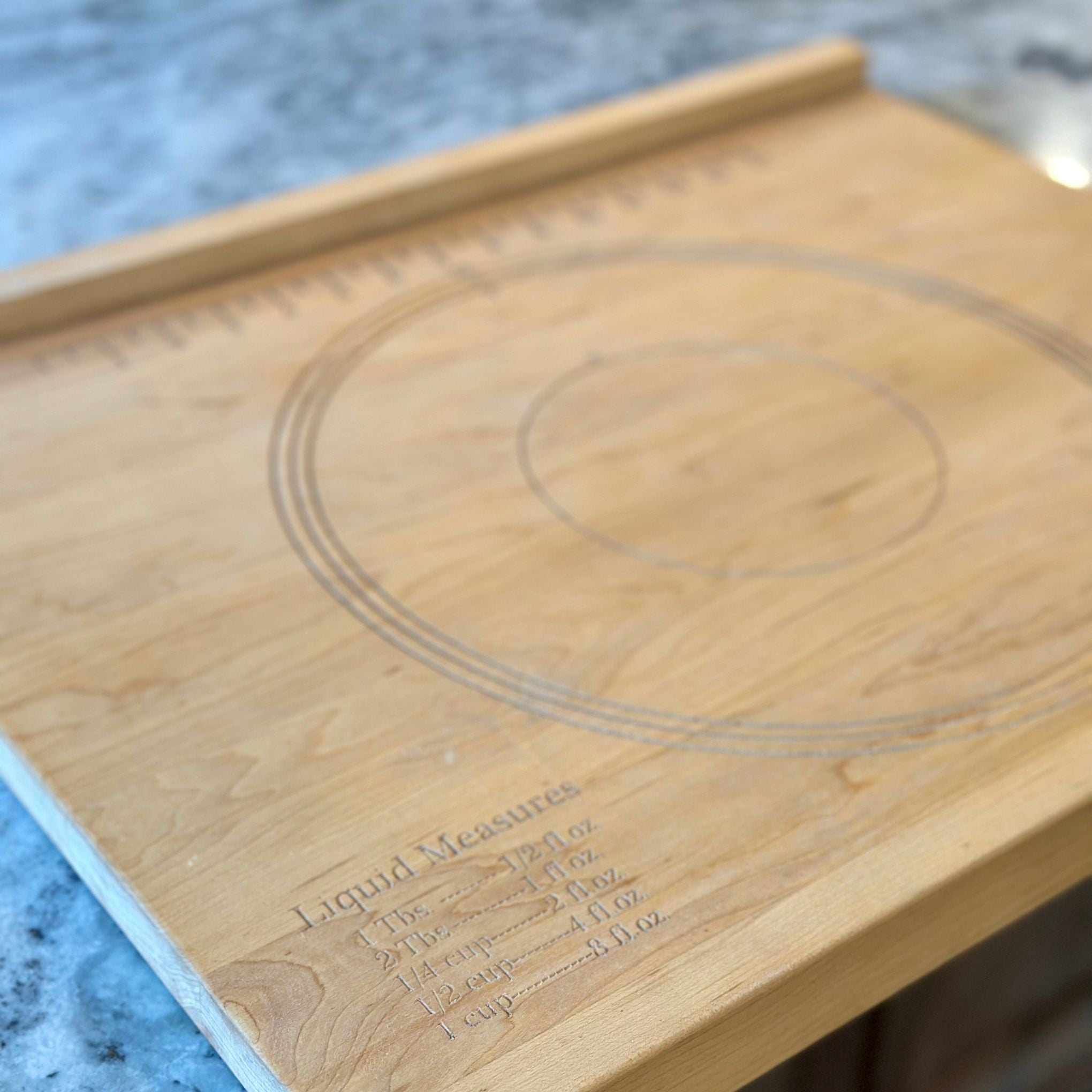 We also engraved the wooden pastry board with a 14″ ruler and four circles (6″, 8″, 9″ and 10″) for rolling the perfect crust. And bonus! We added handy conversion charts for liquid and dry measurements, so you don’t have to Google with sticky hands.